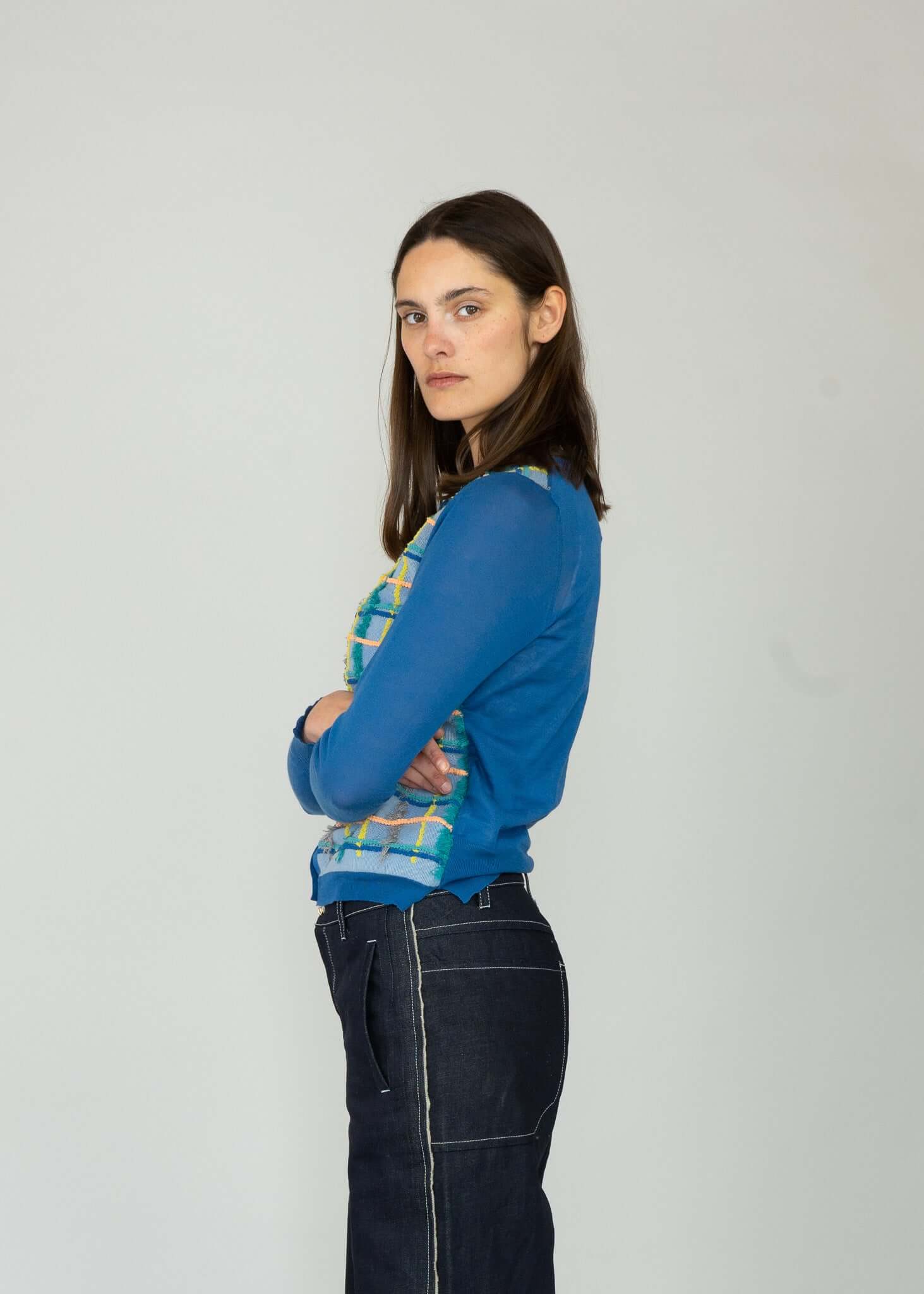 Strickweste mit Knopfverschluss, Vorderteil mit Karo-Muster, Rückenteil und Ärmel uni