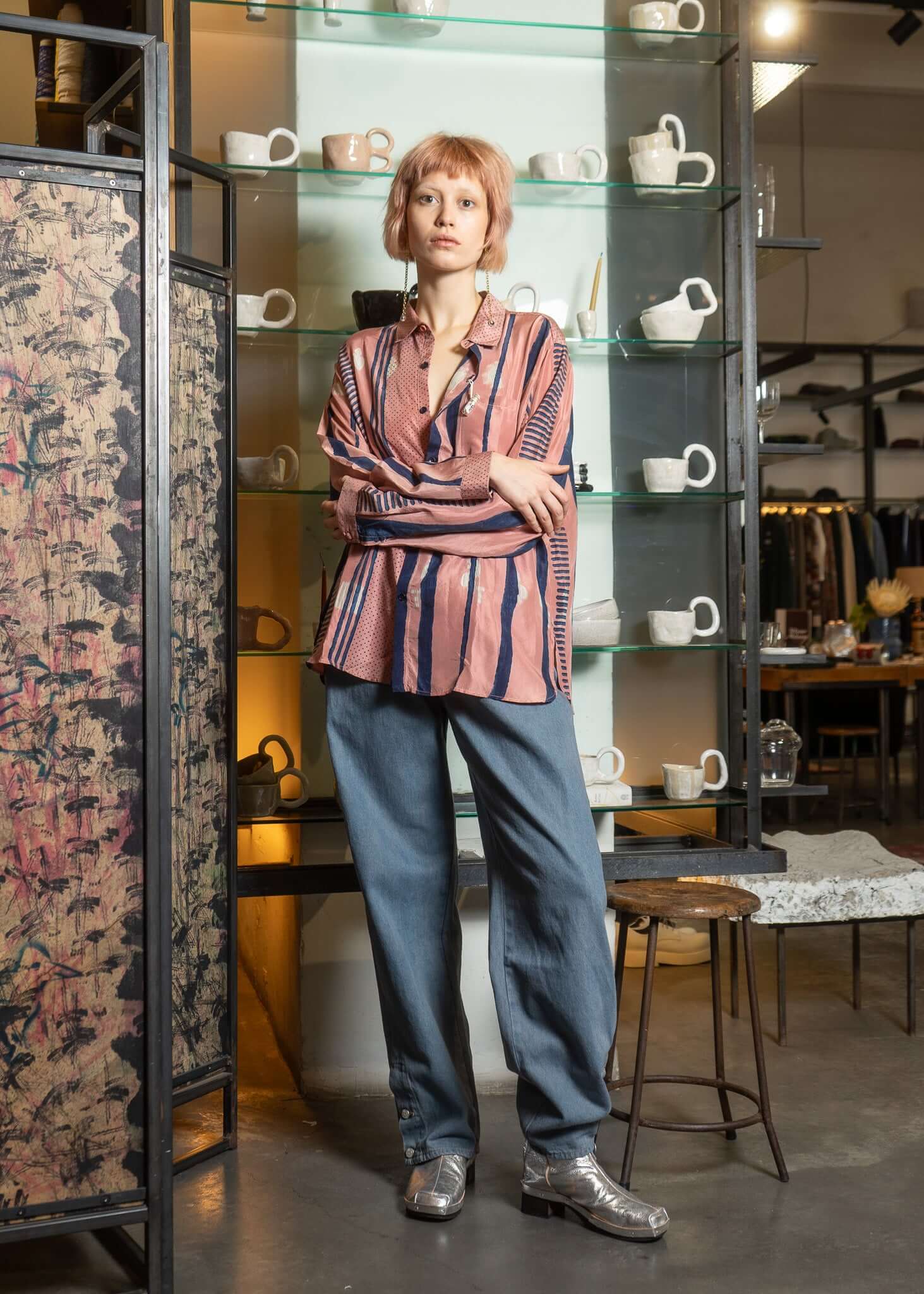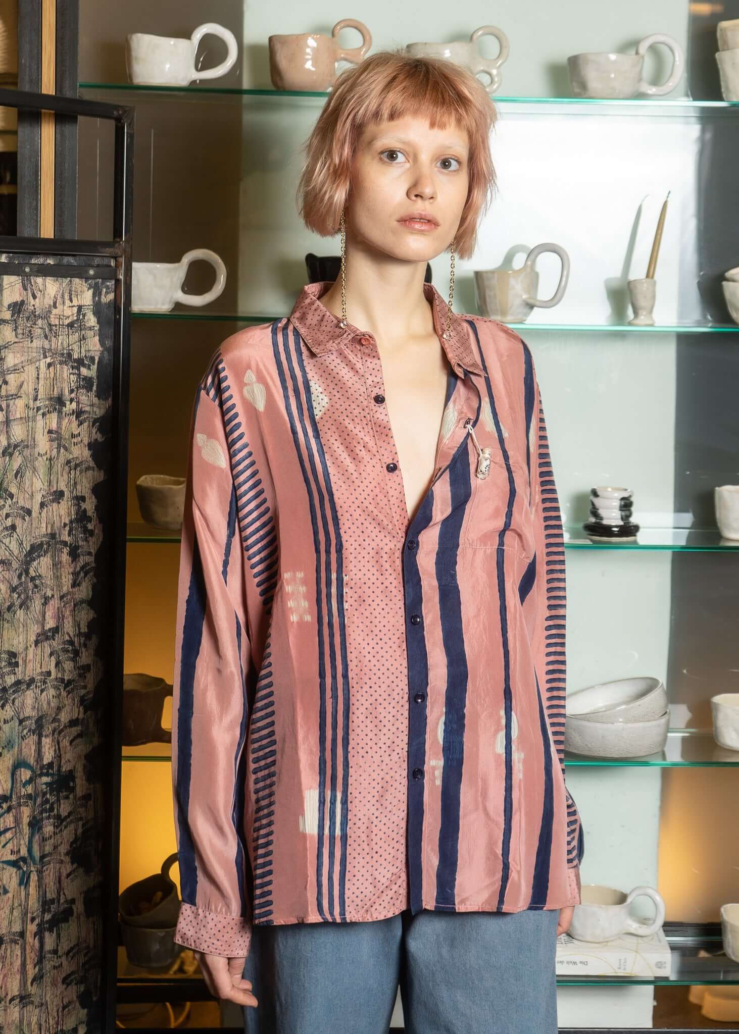 Hemd mit klassischem Kragen, langen Ärmeln, Knopfverschluss und einem einzigartigen Muster und Motiven versehen, die durch zarte Shibori Technik und Handblockdruck entstehen.