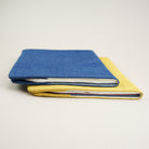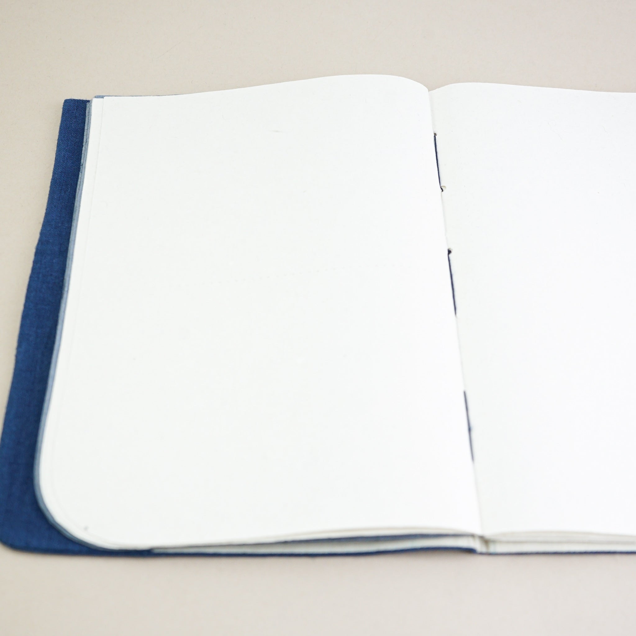 Notizbuch aus handgeschöpftem Papier im Format A6 , hergestellt aus Papier, das aus Stoffresten von ungefärbter, indigo, roter und grauer Baumwolle hergestellt wurde. Der Einband ist aus Khadi-Baumwolle gefertigt und hat eine Tasche auf einer Seite.