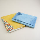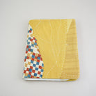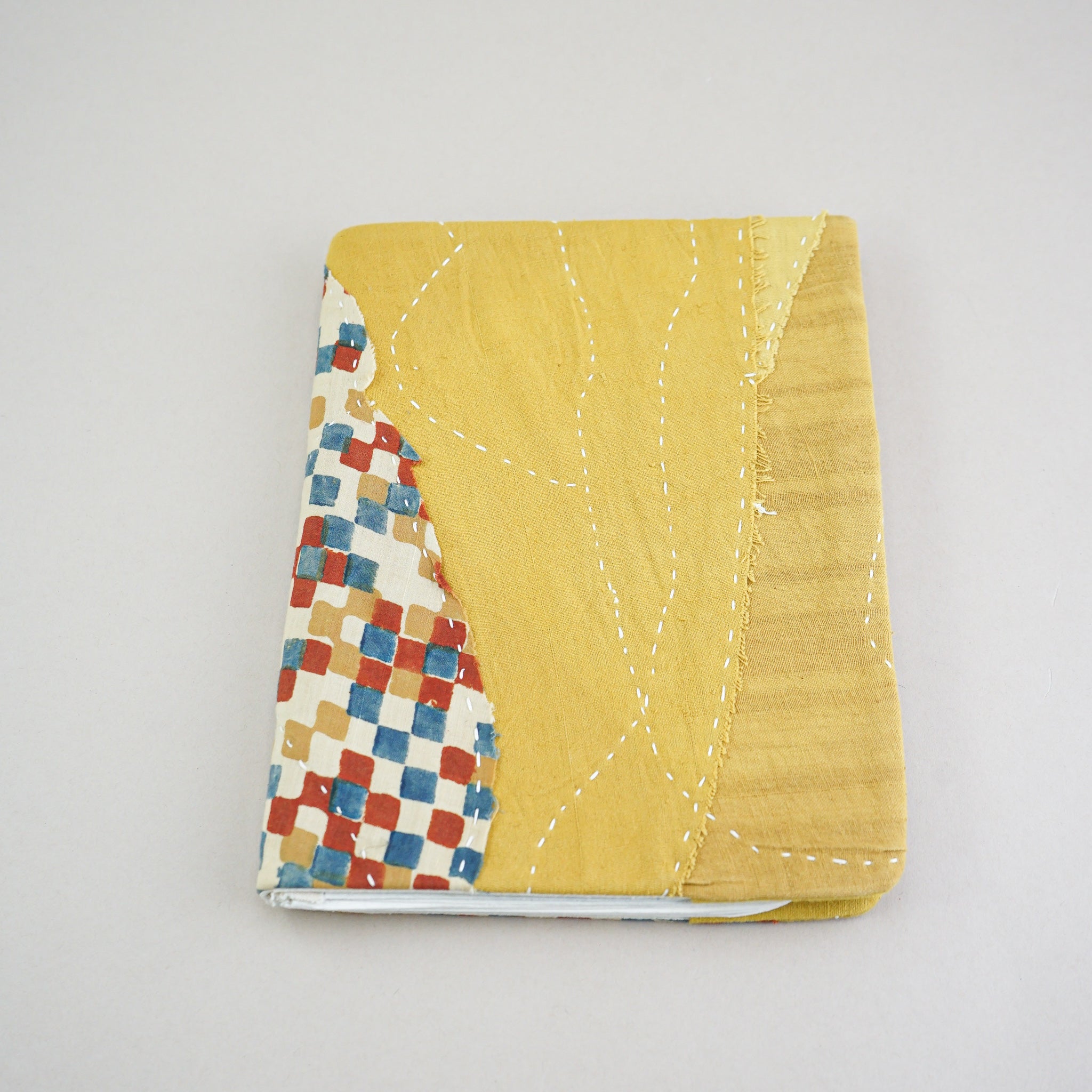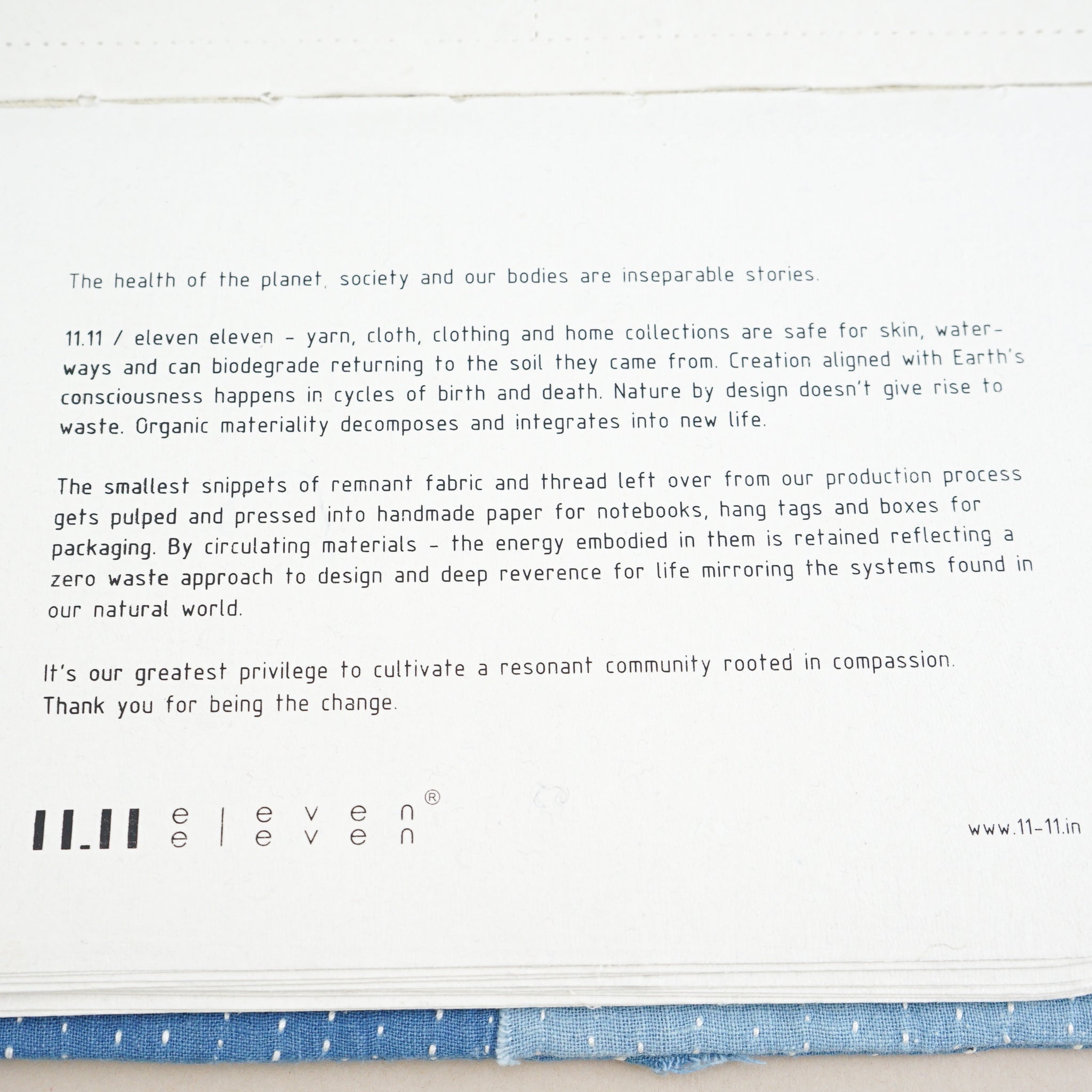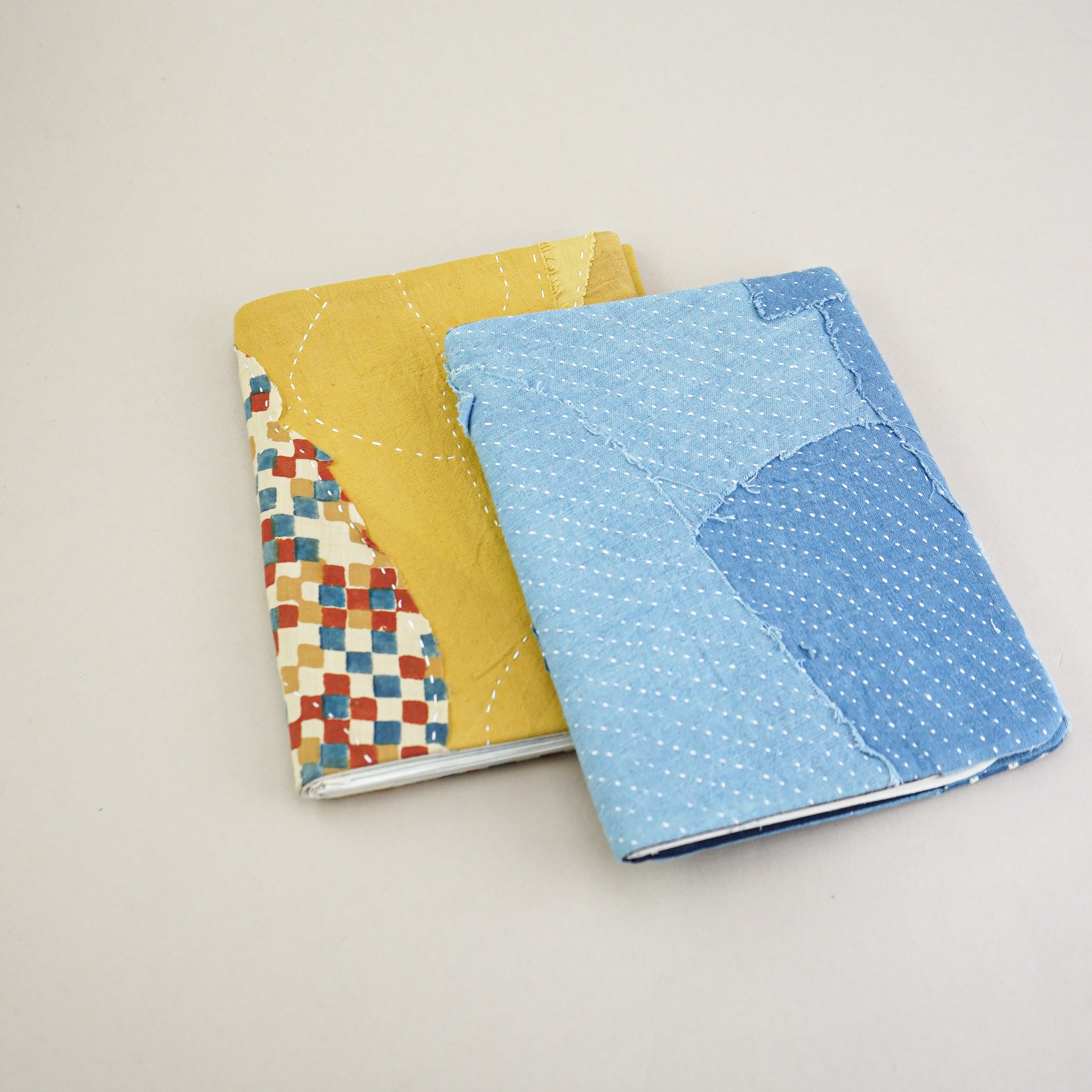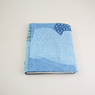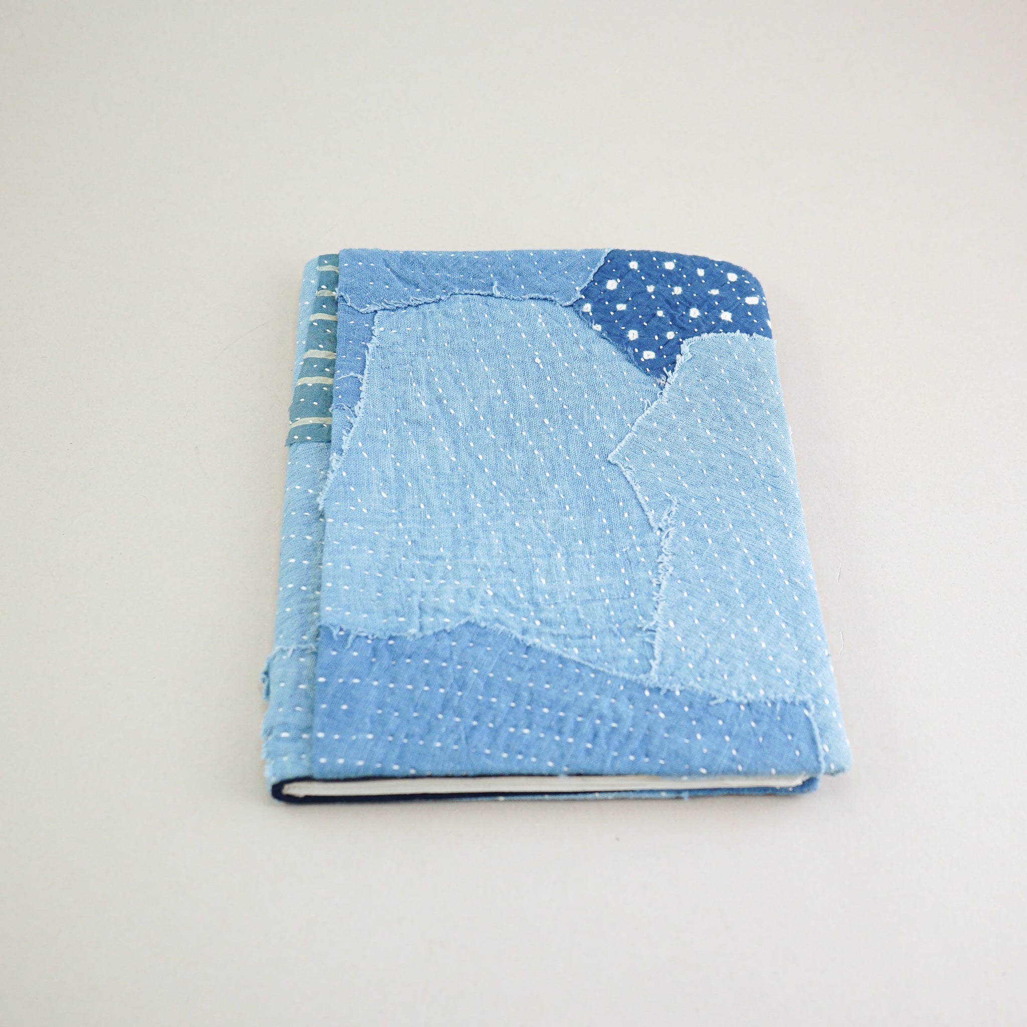 Notizbuch aus handgeschöpftem Papier im Format A6 , hergestellt aus Papier, das aus Stoffresten von ungefärbter, indigo, roter und grauer Baumwolle hergestellt wurde. Der Einband besteht aus recyceltem Patchwork-Kantha und hat eine Tasche auf einer Seite.