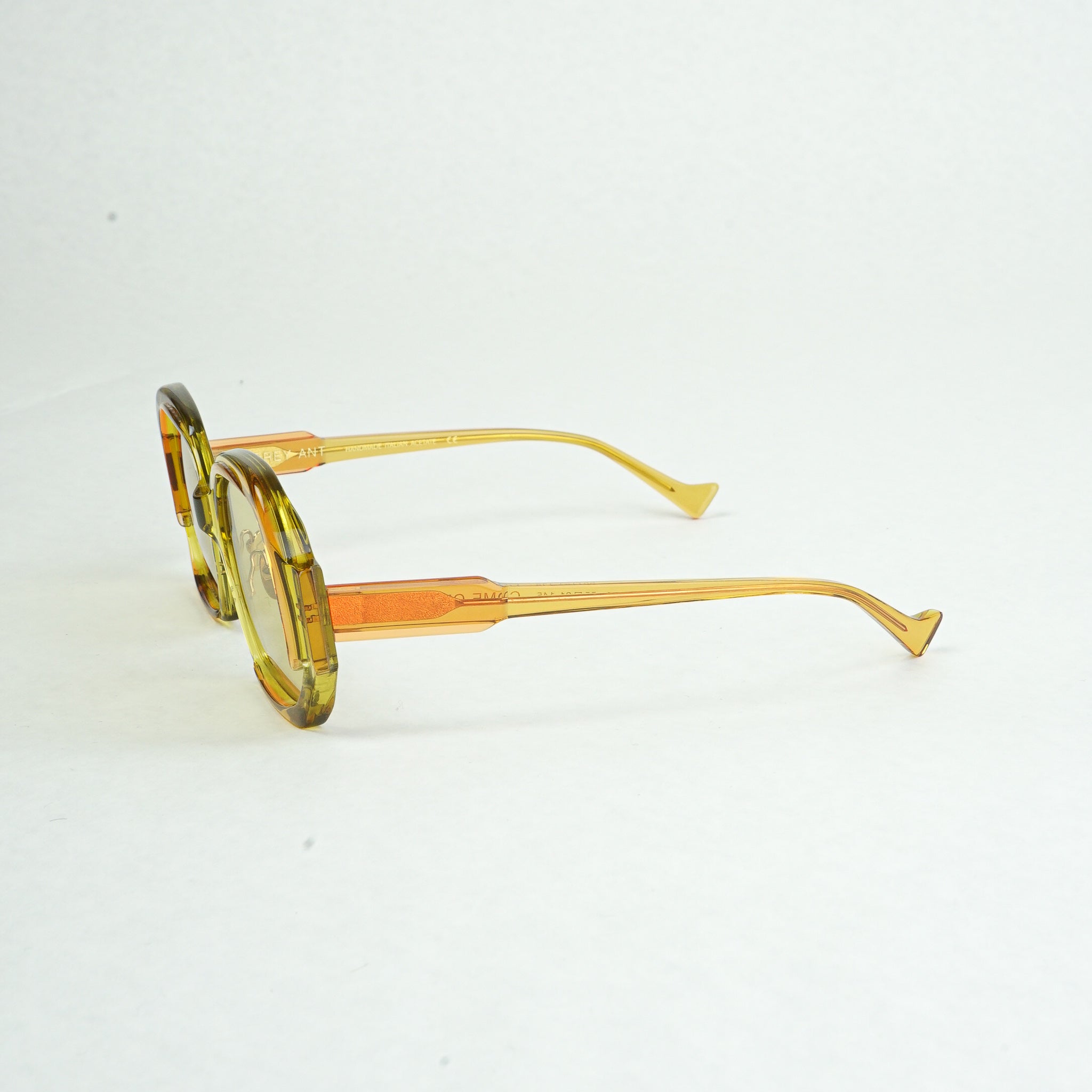 Handgefertigte, runde, transparente Sonnenbrille mit Acetatrahmen in Goldton.
