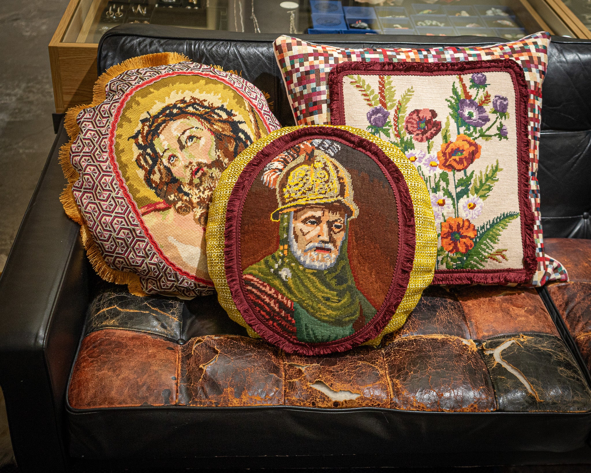 Jedes Kissen ist ein Unikat: Handgestickte Gobelinbilder treffen auf ausgewählte Vintage-Möbelstoffe und seltene Dead-Stock-Materialien.