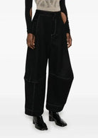 Leicht gecroppte Hose aus Loden, mit weißen Nähten, zwei Seitentaschen, einer Hintertasche und mit Knopf und Reißverschluss zu schließen