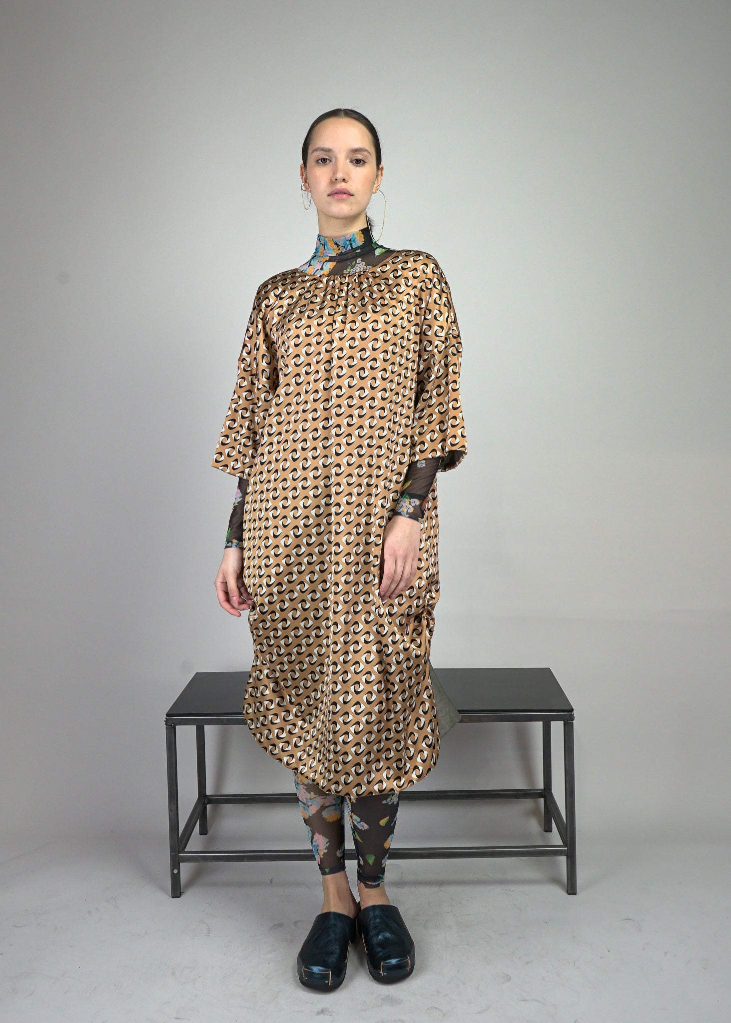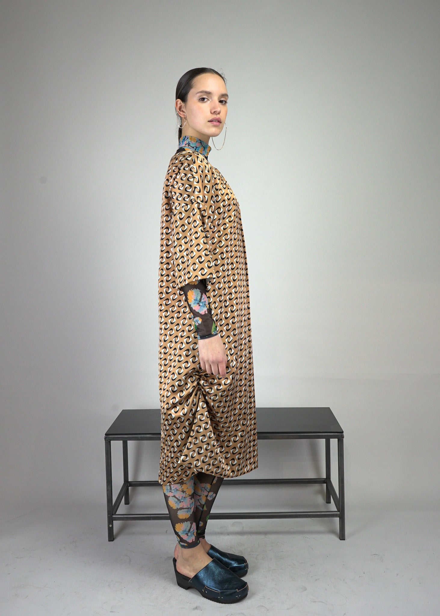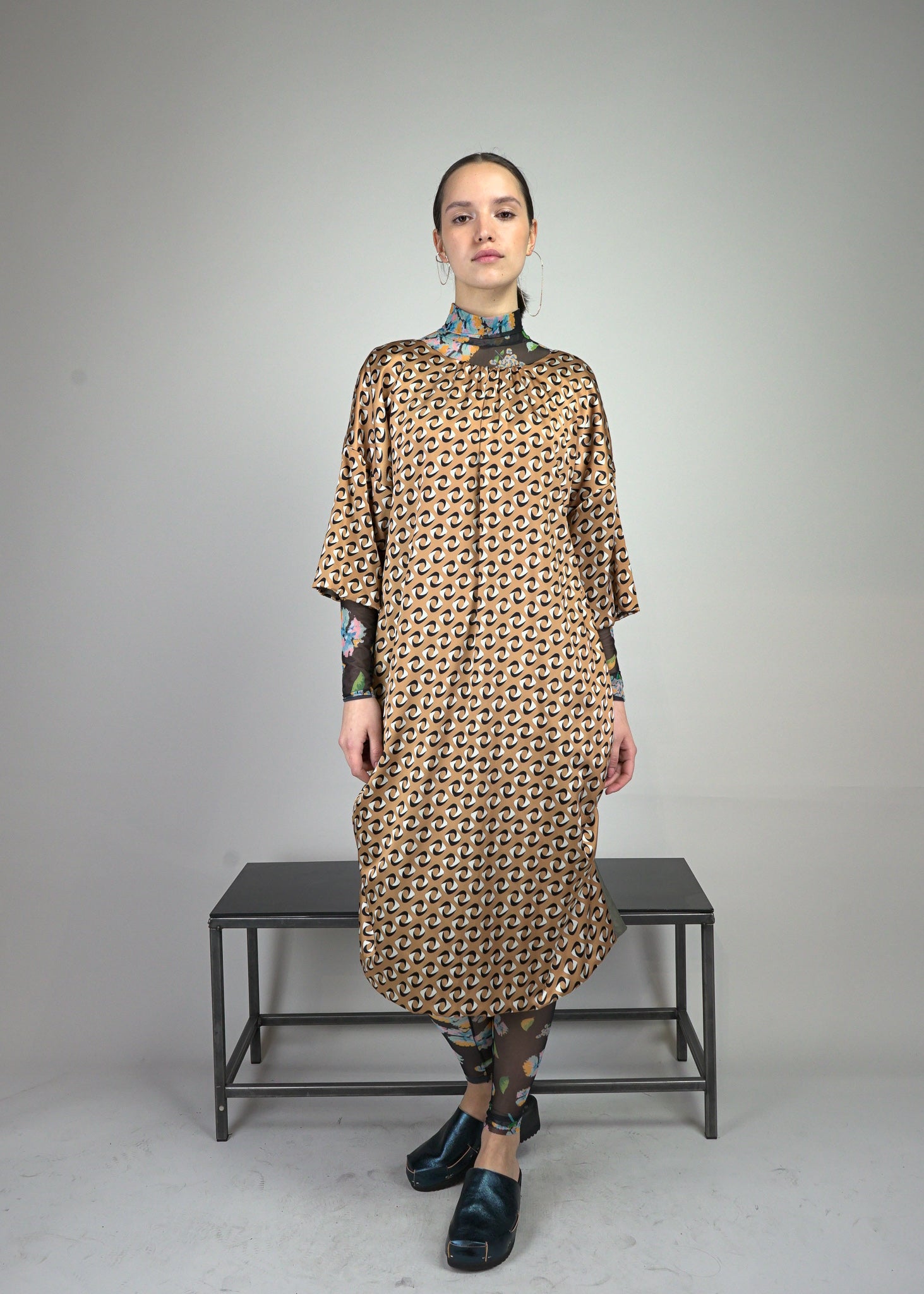 Schwer fallendes, gefüttertes Seidenkleid, gerade geschnitten, Raffungen und Schlitze an den Seiten, mit Seitennahttaschen.