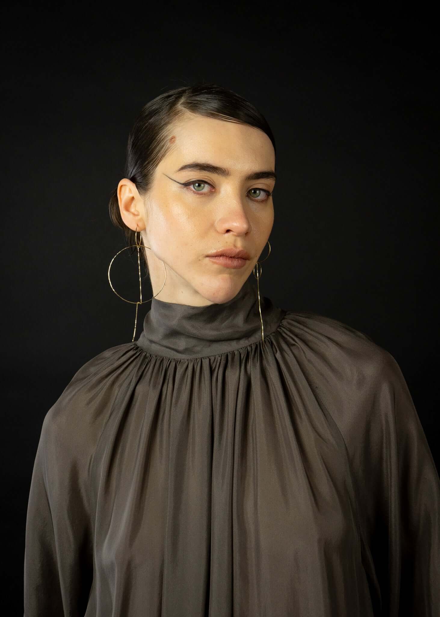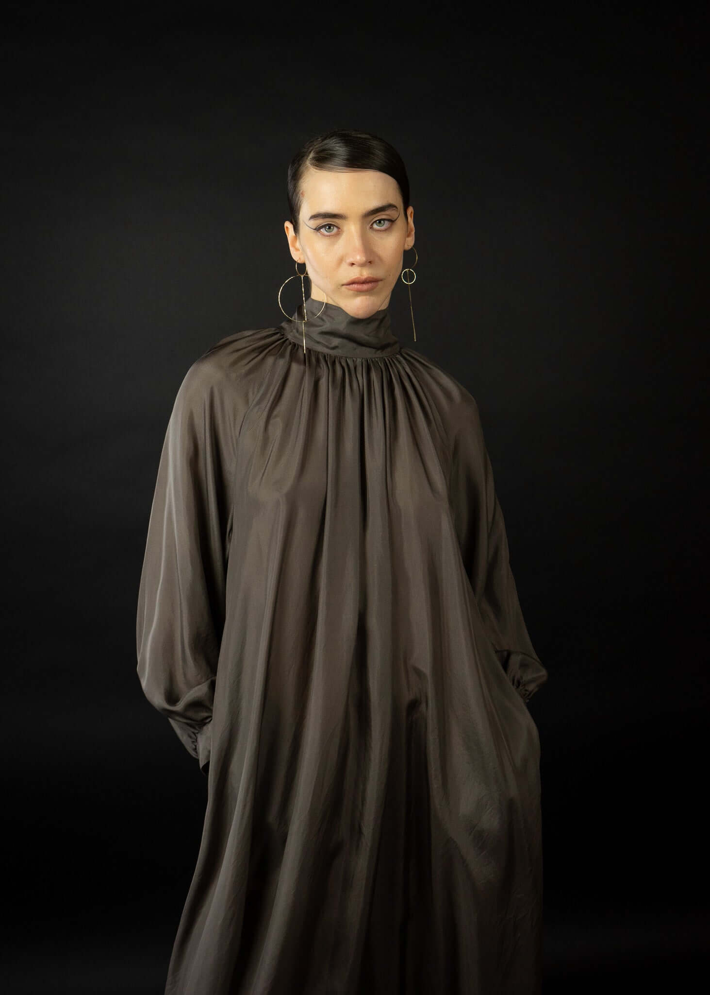 Kleid aus feinem Seidenponge mit Raglan Ärmel, Bindekragen und Manschetten.