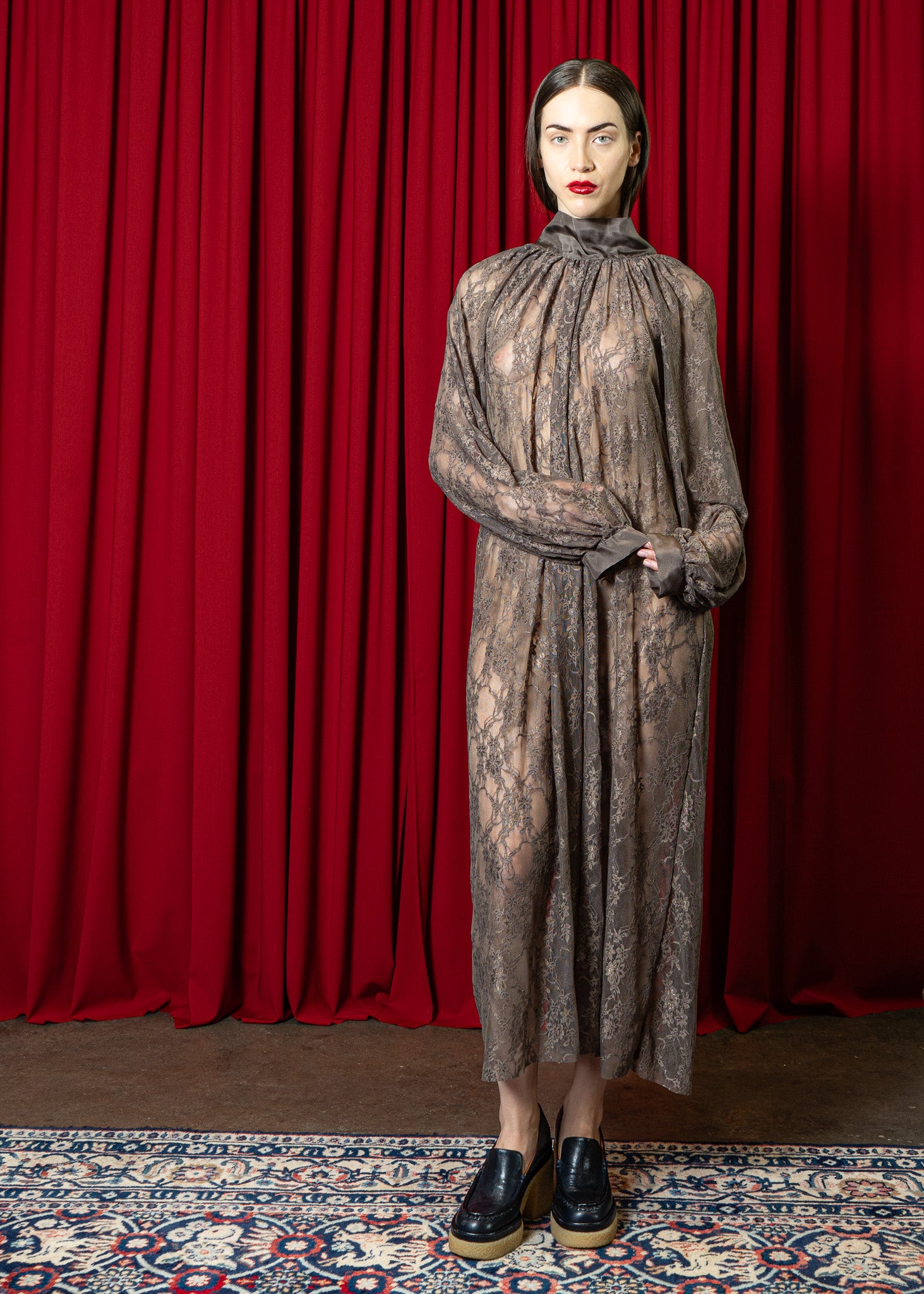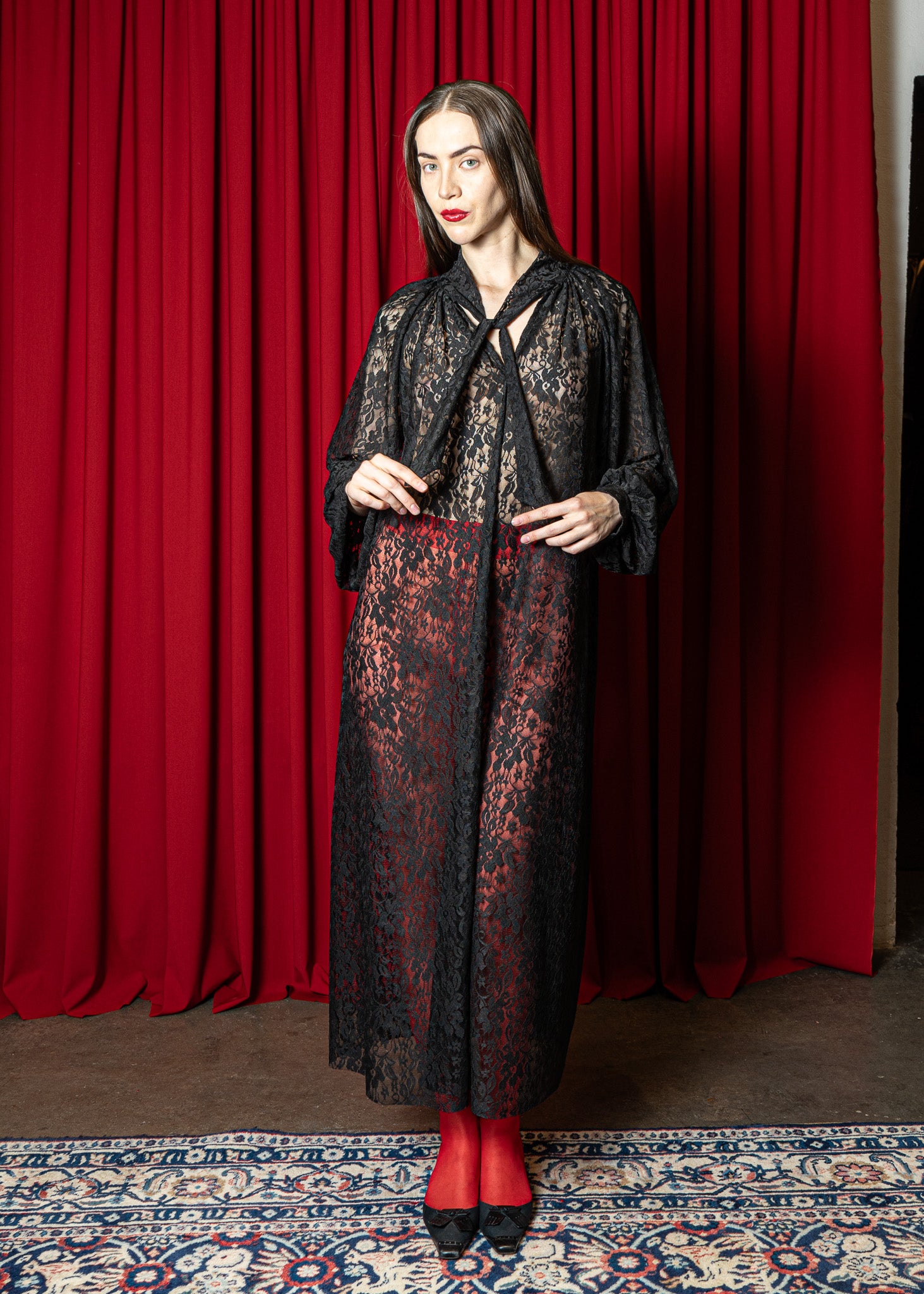 Transparentes Spitzenkleid mit Raffung am Halsausschnitt, kann auch so getragen werden dass der Schlitz im Rücken vorne ist