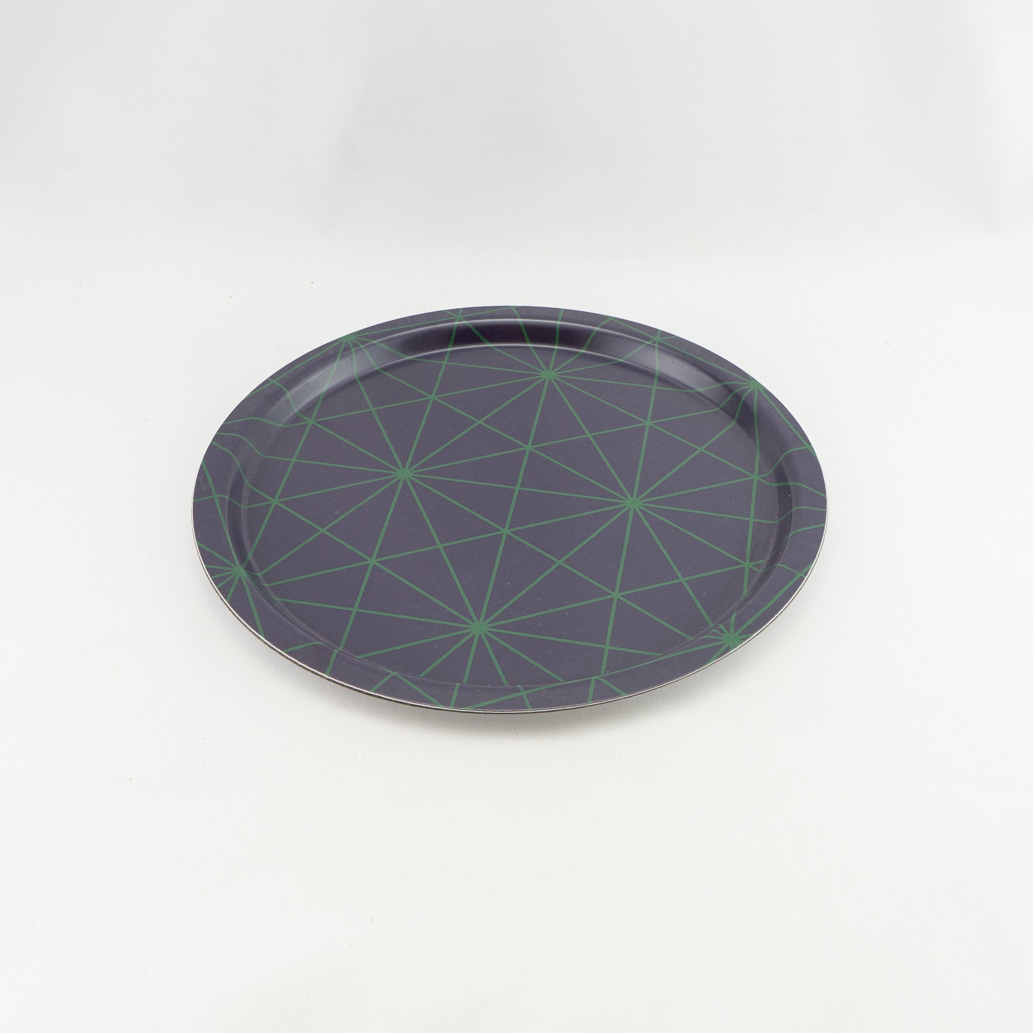 Dieses Tablett enthält einen originalen Matrix-Siebdruckstoff. In der Werkstatt in Basel wird der Stoff von Hand bedruckt und anschliessend in einem Furnierverfahren in die Tablettform gepresst.