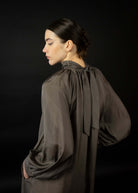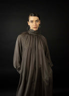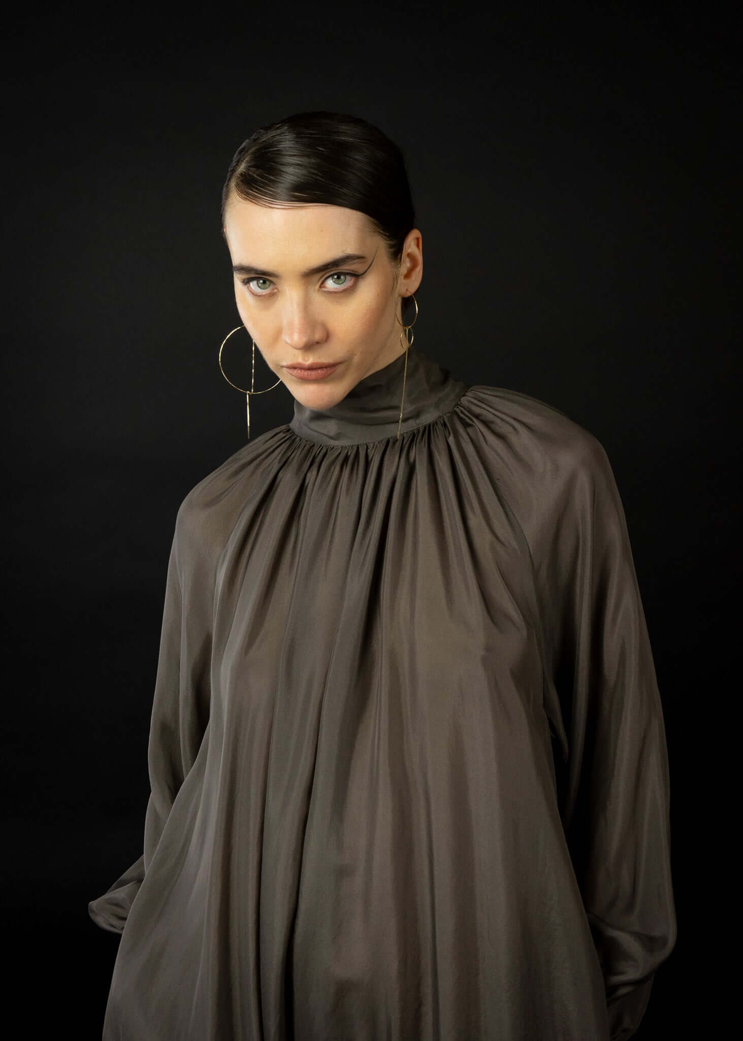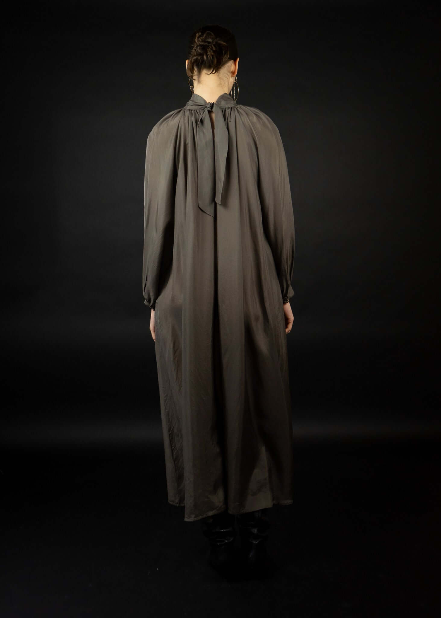 Kleid aus feinem Seidenponge mit Raglan Ärmel, Bindekragen und Manschetten.