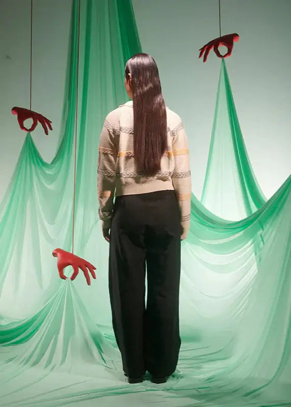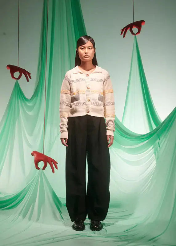 Cardigan Wollweste mit Knopfleiste vorne und zwei aufgesetzten Vordertaschen mit dunkelgrünen Nähten.