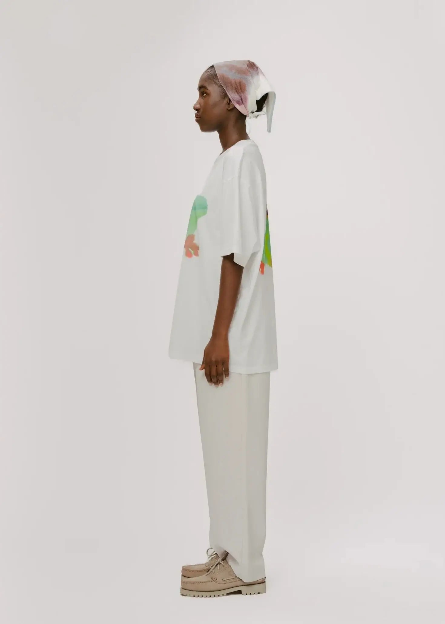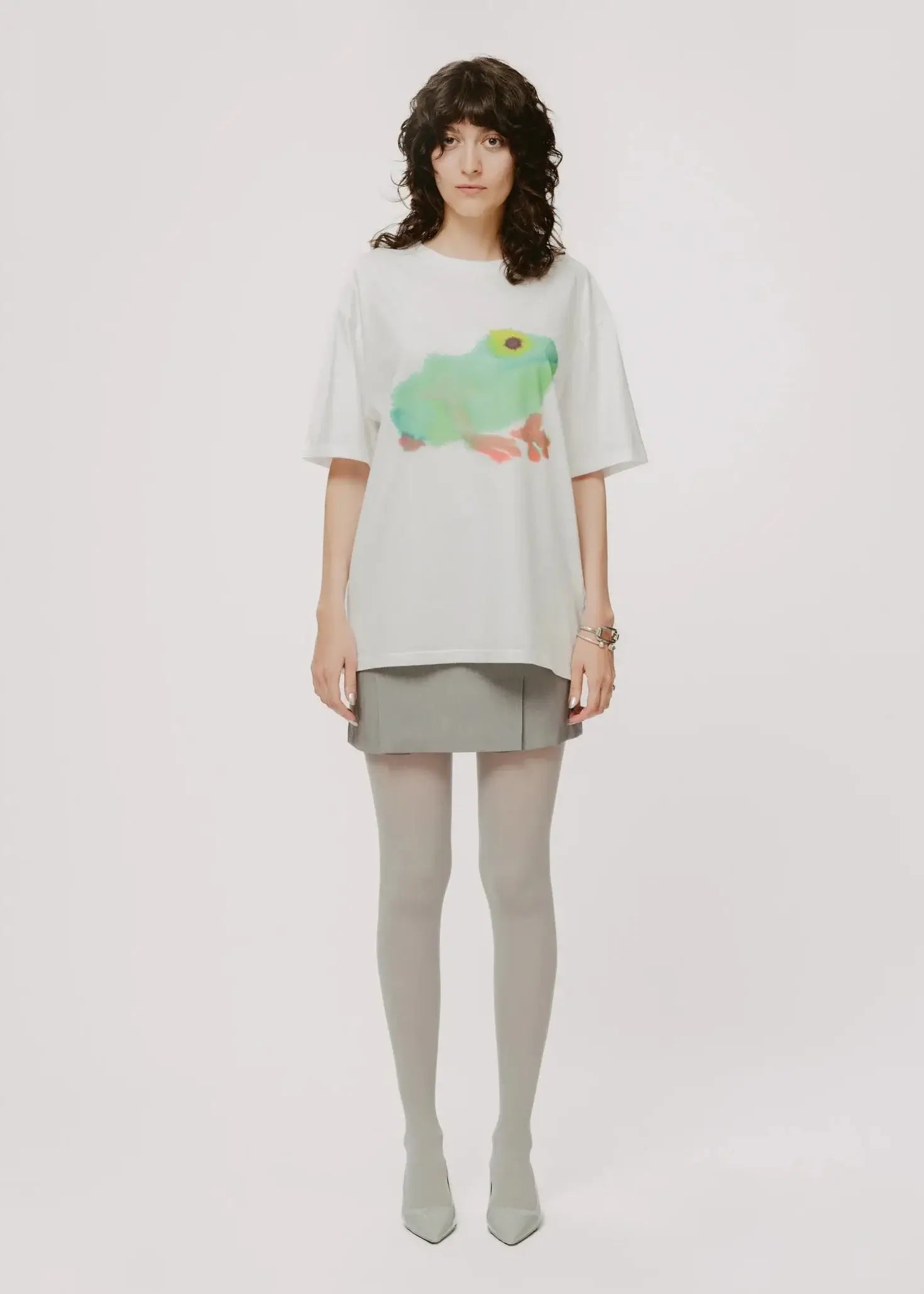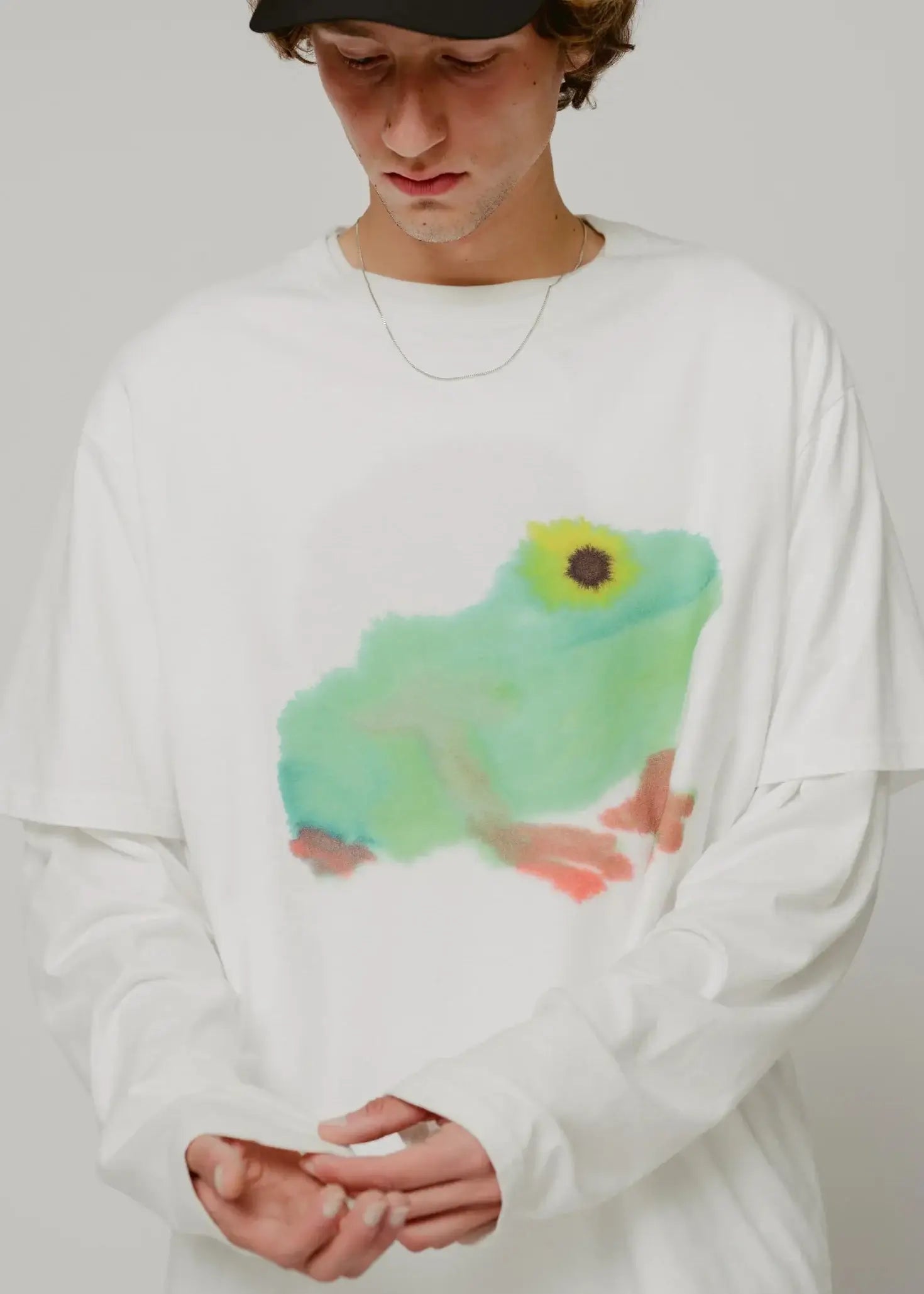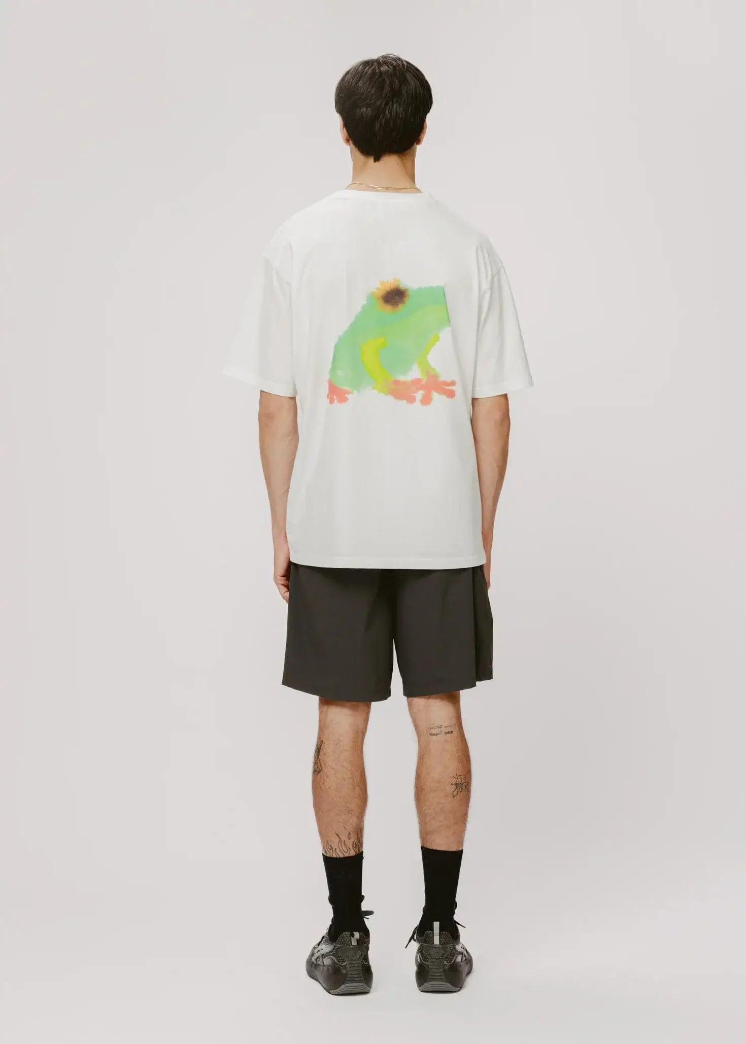 Ein weißes Unisex-T-Shirt mit einem Frosch auf der Vorderseite und einem Frosch auf der Rückseite. Der Stoff, aus dem dieses T-Shirt hergestellt wurde, ist GOTS-zertifiziert.