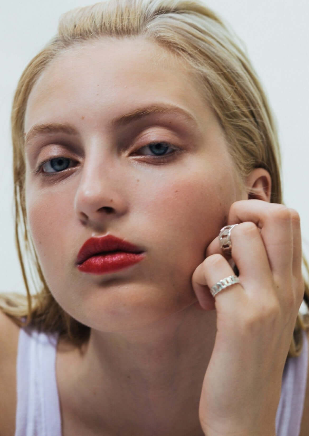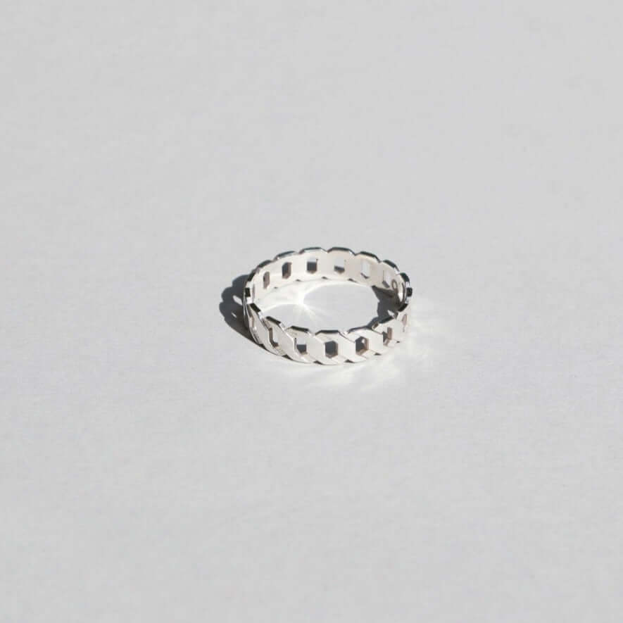 Der Ring liegt wie eine flache Kette um den Finger und besteht aus achteckigen Kettengliedern.