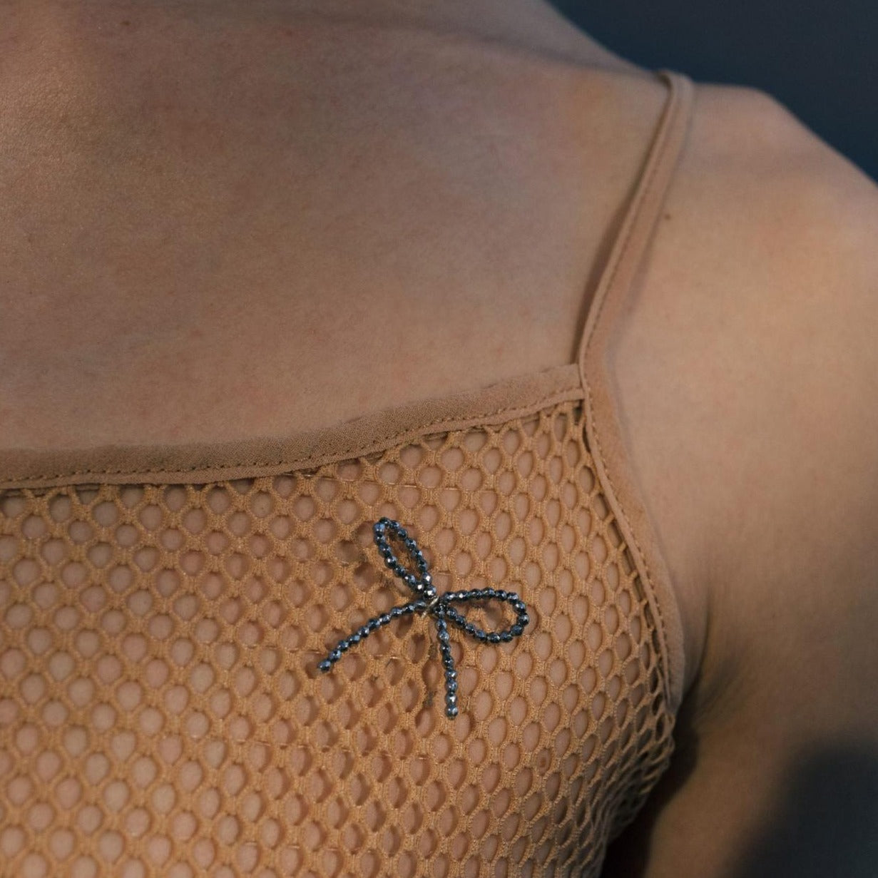 Eine funkelnde kleine Brosche in Form einer Schleife.