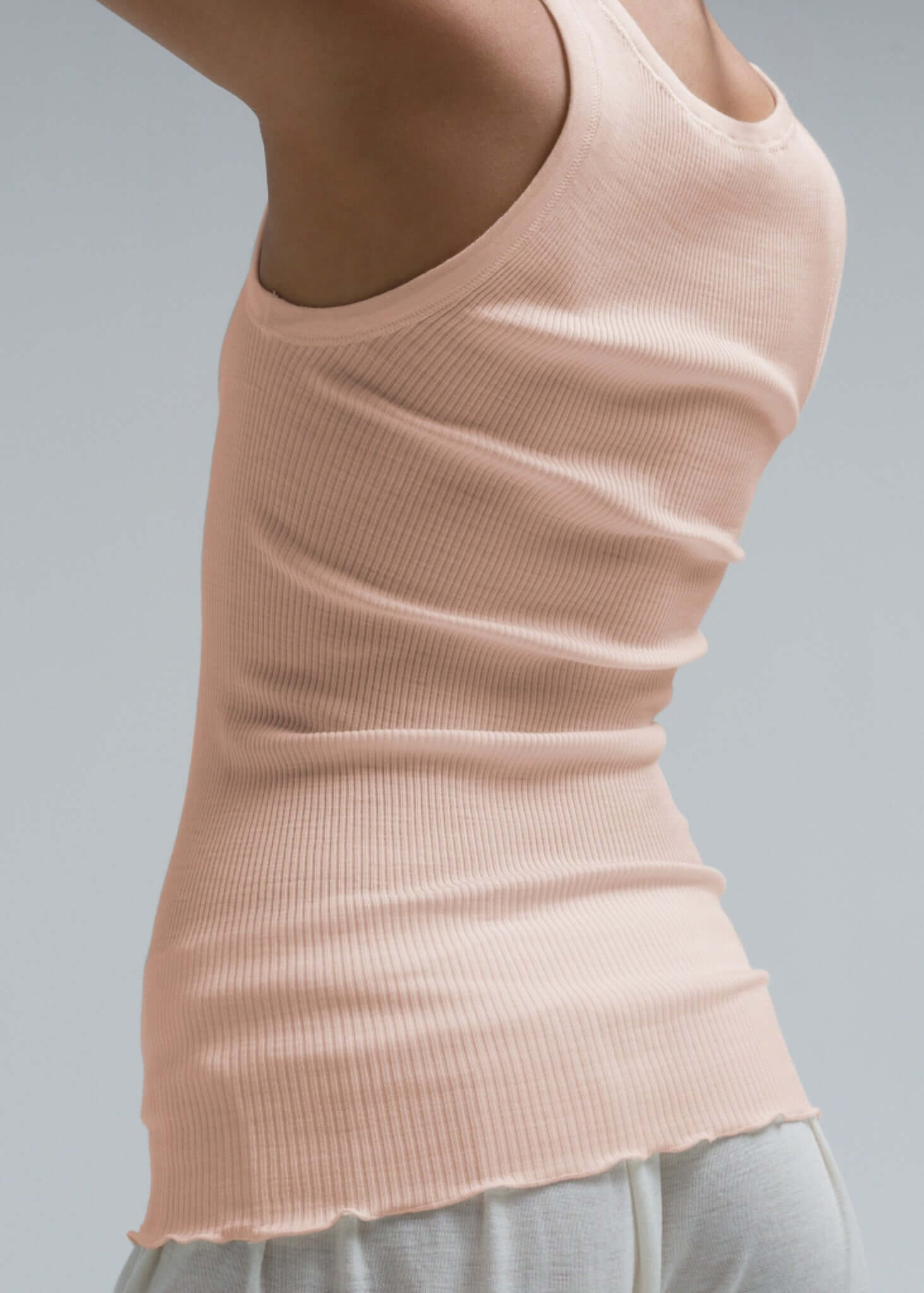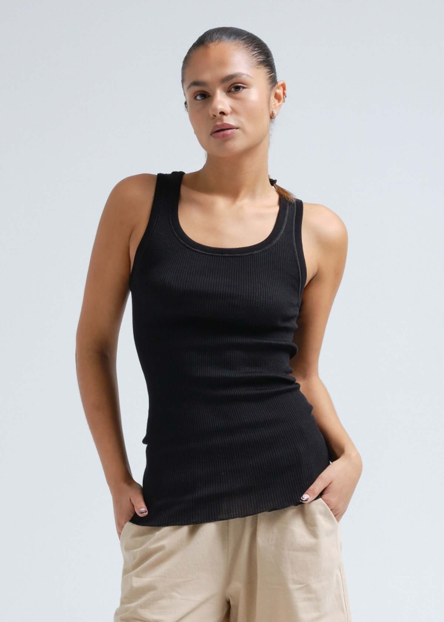 Tank-Top mit halbtiefem Halsausschnitt und  Lettuce Saum. Tragen Sie es mit der Rückseite vorne für unterschiedliche Looks. Keine Seitennähte. Durch den Ripp Jersey sehr flexible Passform.