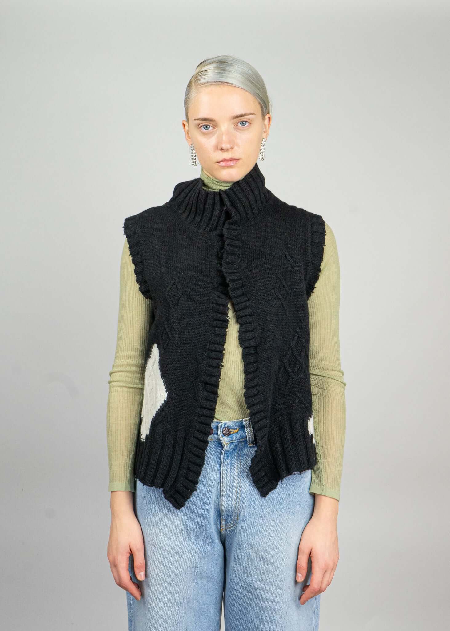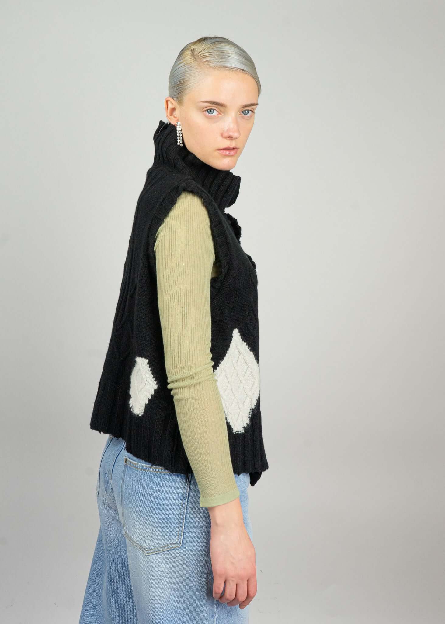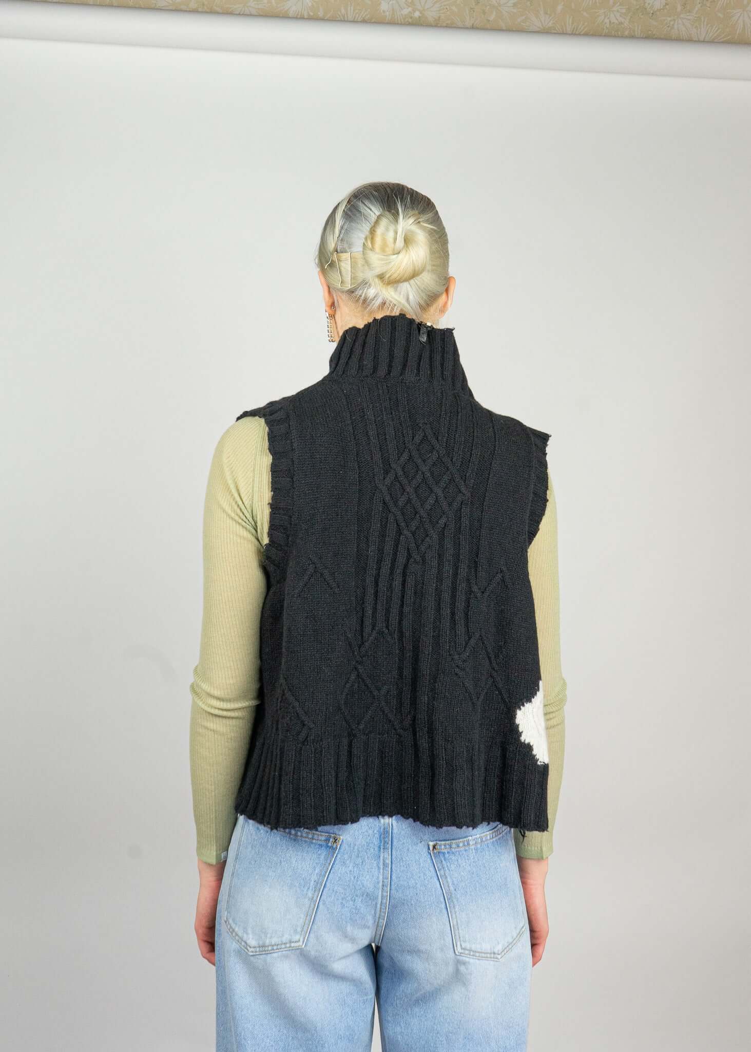 Warmes und bequemes Gilet mit Aran-Motiv und Intarsien aus feiner Merinowolle. Knopfverschluss im oberen Teil.