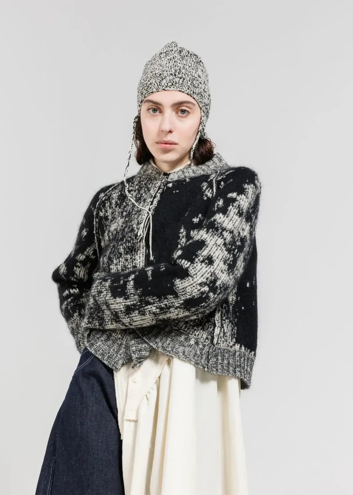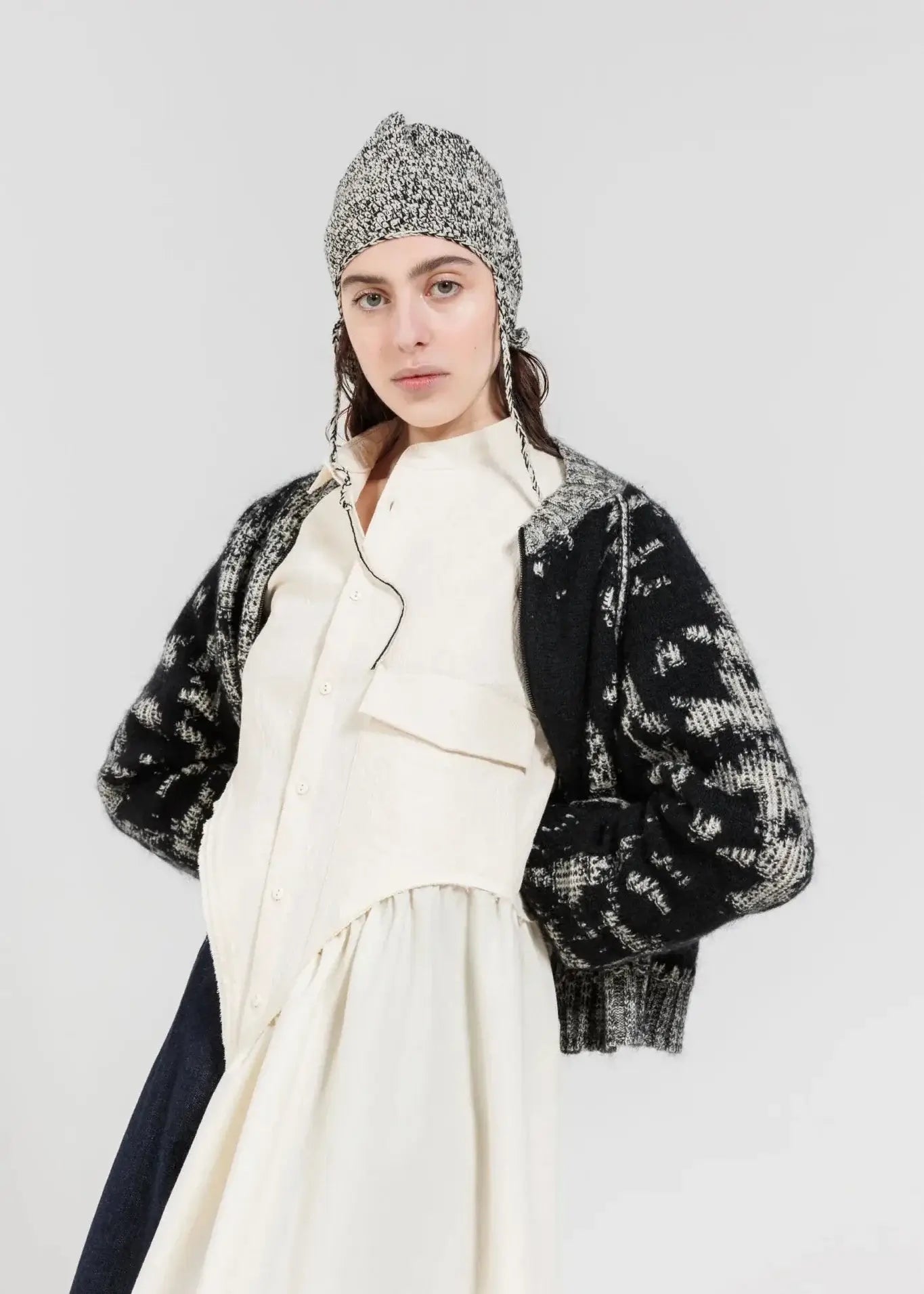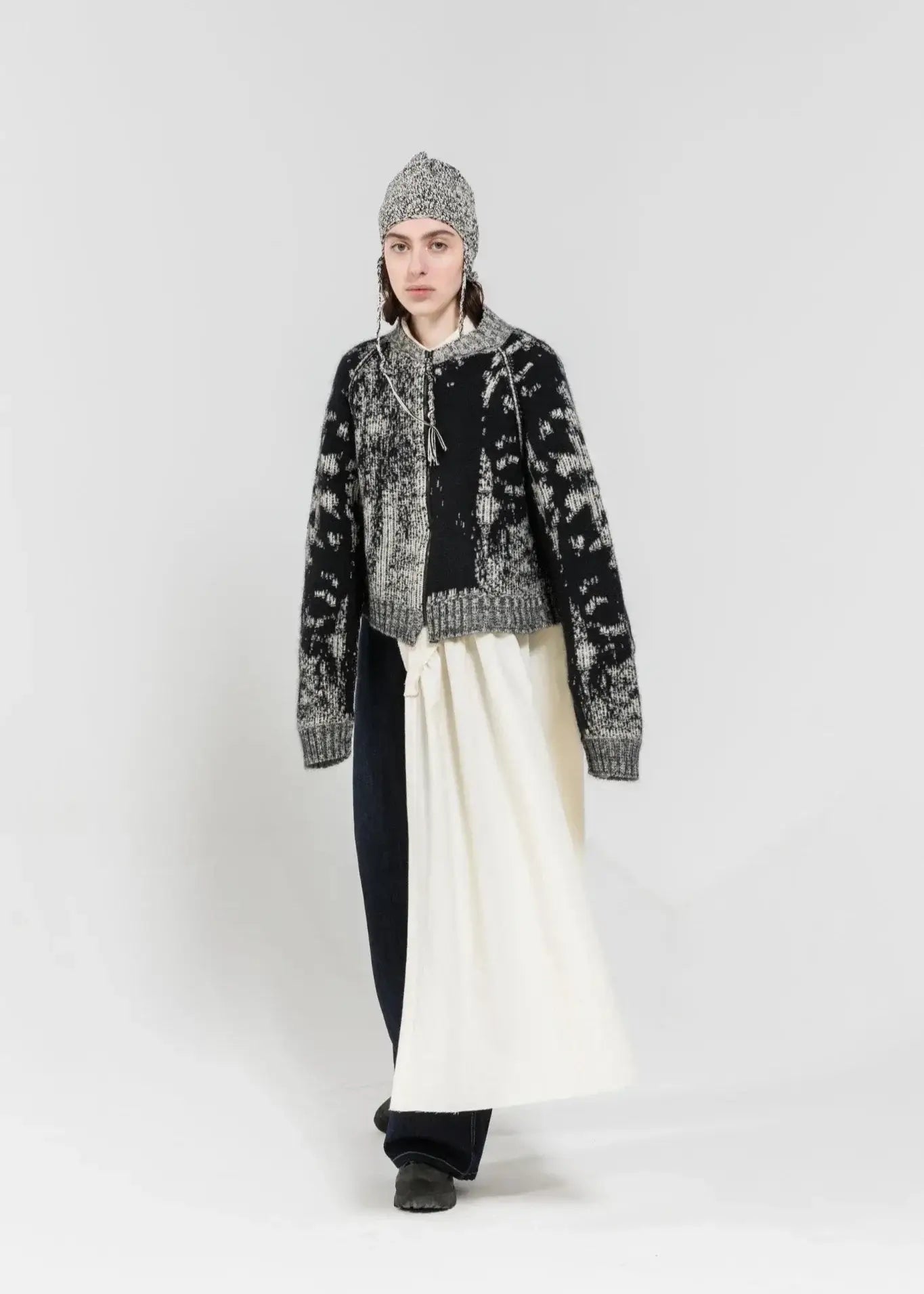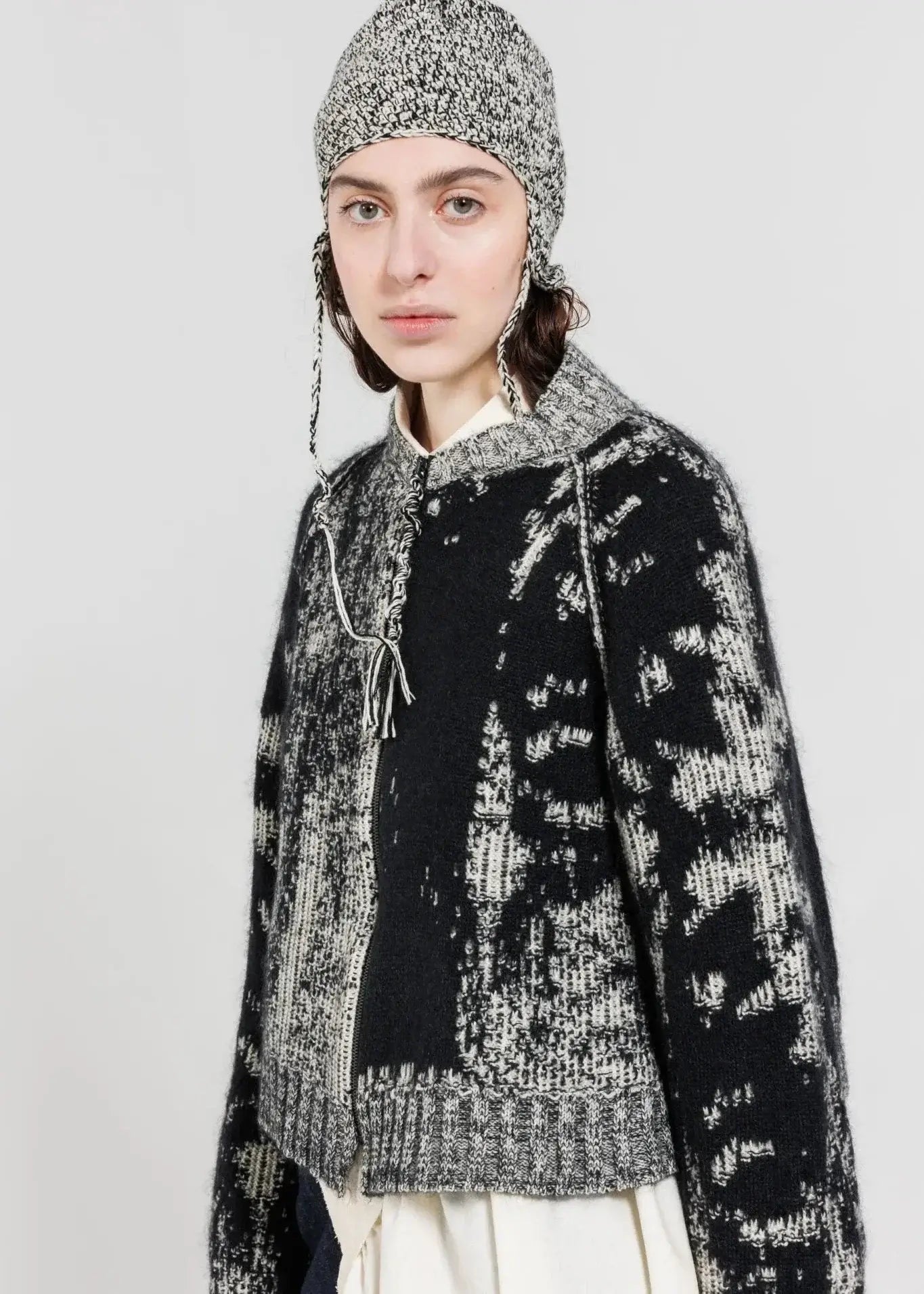 Weicher und bequemer Bomber mit einem abstrakten Jacquard-Motiv aus drei Garnen. Das Design ist nicht nur auf die Oberfläche gedruckt, sondern in die Struktur des Kleidungsstücks integriert.