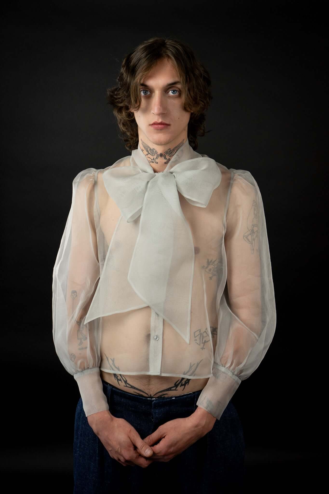 Diese Bluse aus Seidenorganza ist ein absolutes Statement Piece. Die Bluse hat eine XL Schleife, Puffärmel und Manschetten.