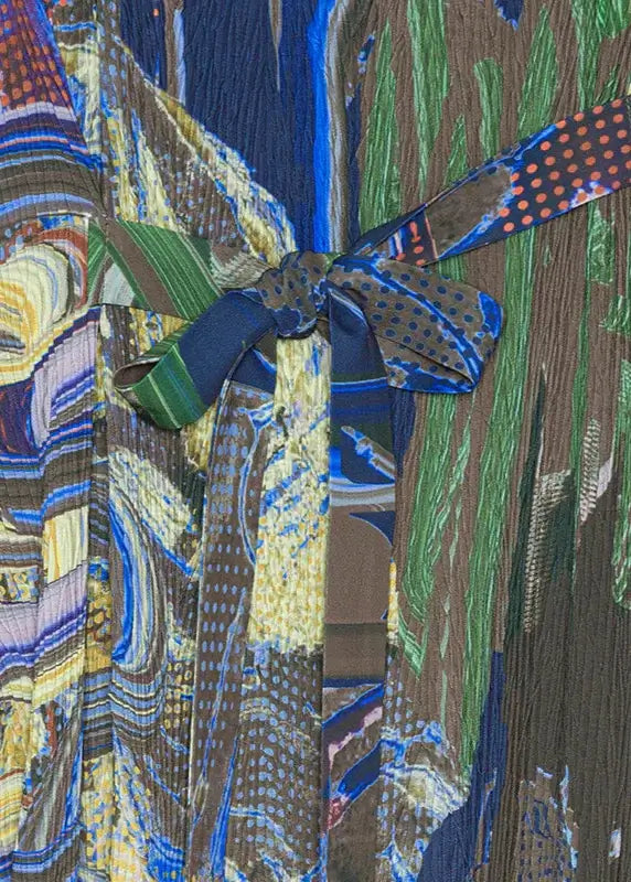 Flowing dress with an abstract print, round neckline, long sleeves and a waist tie