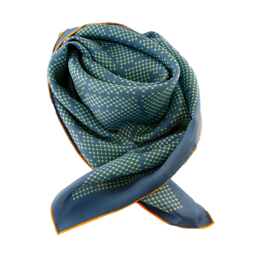 A scattered pattern composed of circular and star shapes explores the square fromat of this foulard. The inspiration is found in microscopic images of tears.