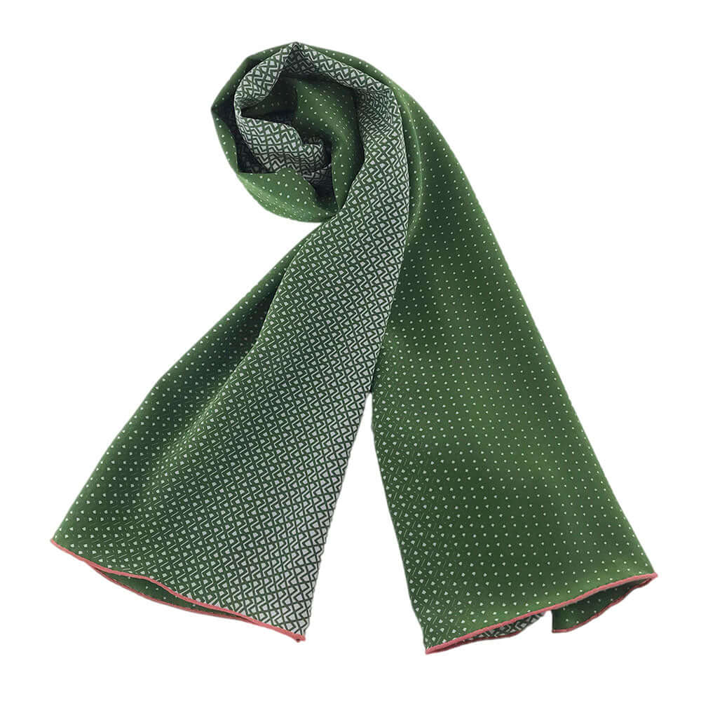 Seemingly endless salt deserts and salt mountains inspired Matrix to create this design. A colour gradient in the form of a drawing shows its interesting effect when tied in different ways. The elongated format ends with a contrasting rolled hem on the narrow sides.