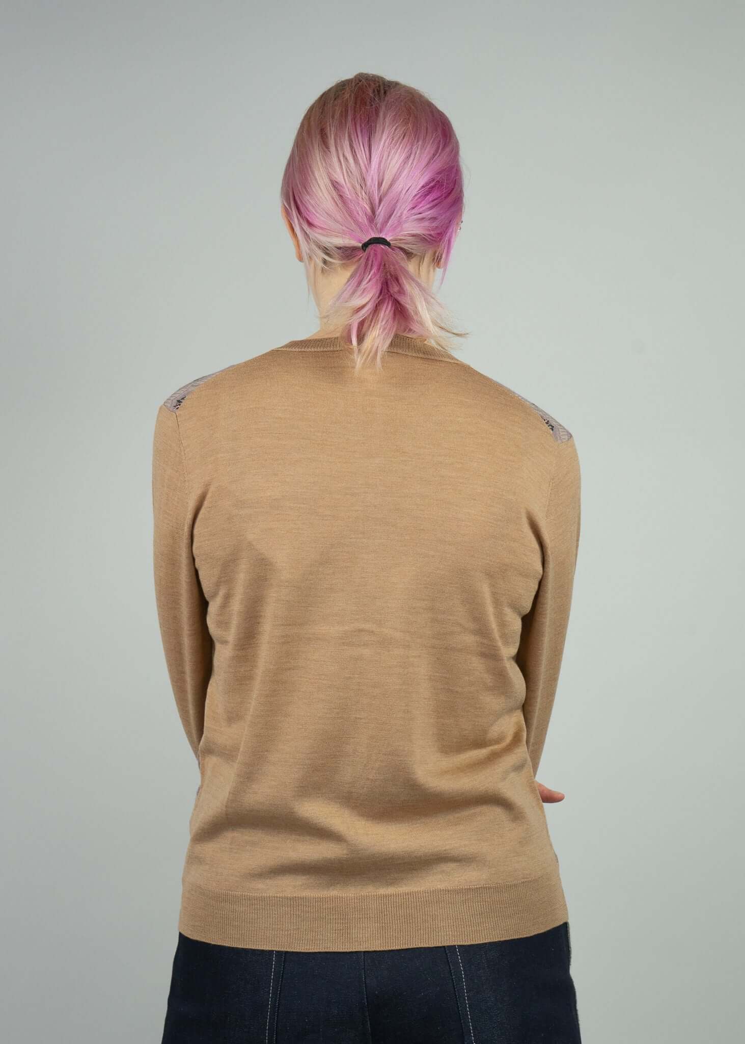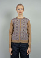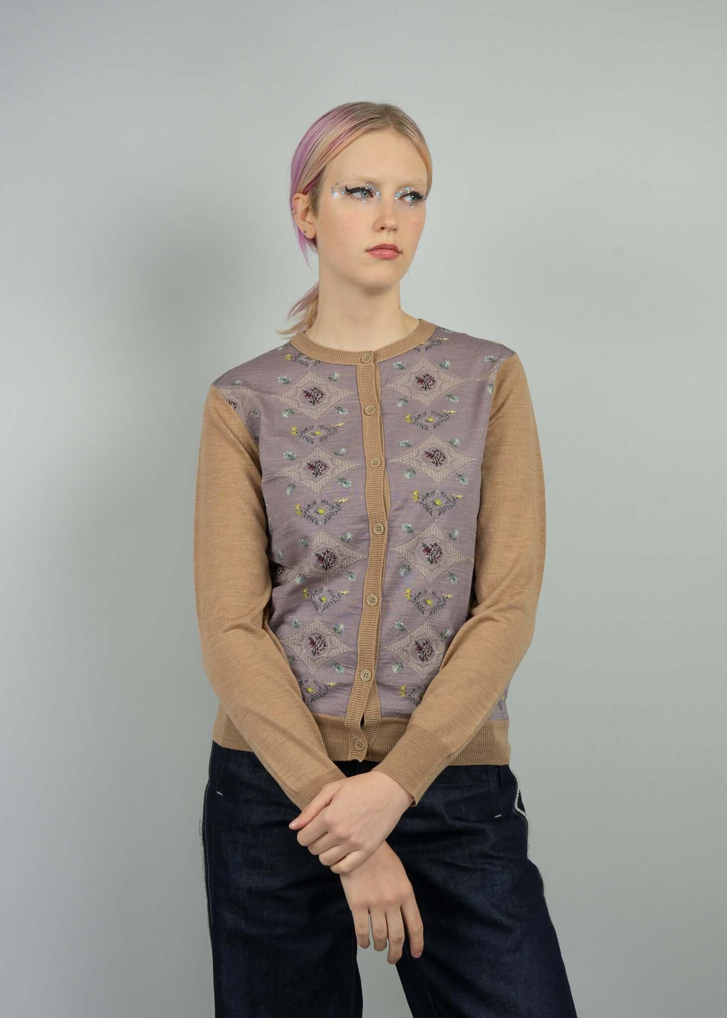 Button-up cardigan with abstract pattern at the front and plain sleeves.