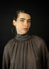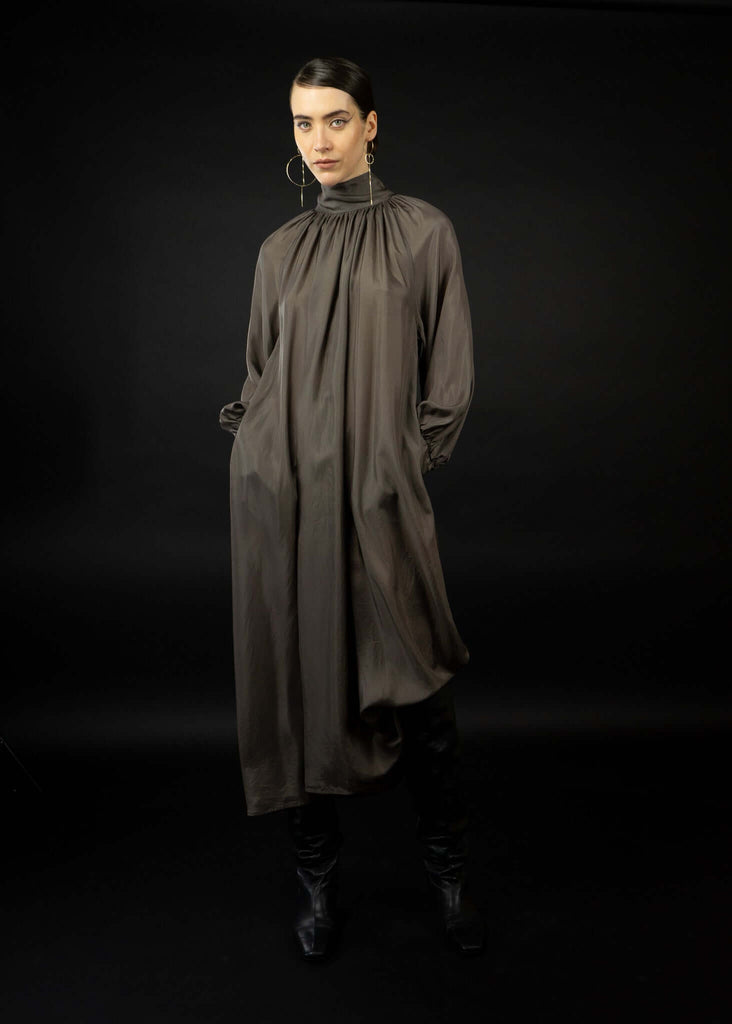 Kleid aus feinem Seidenponge mit Raglan Ärmel, Bindekragen und Manschetten.
