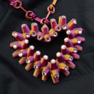 Die Formen reichen von groben Gliederketten über Creolen, die an Tentakel erinnern, bis hin zu überdimensionalen Herzen. Der Schmuck fällt aber nicht nur aufgrund von Form, Größe und Farbe auf – Kristallschliff-Steine verleihen den Kunststoff-Stücken ein besonders opulentes Flair.