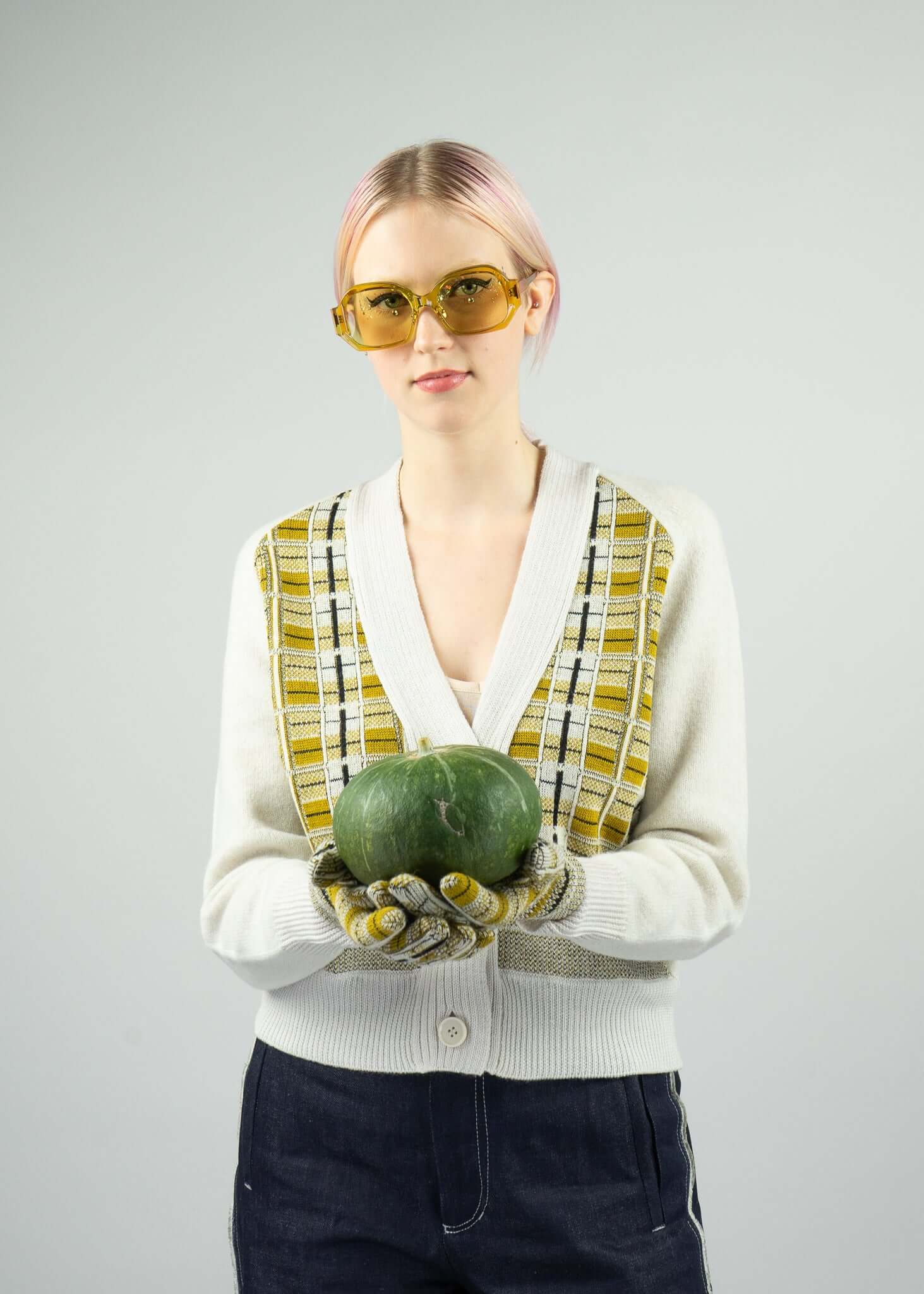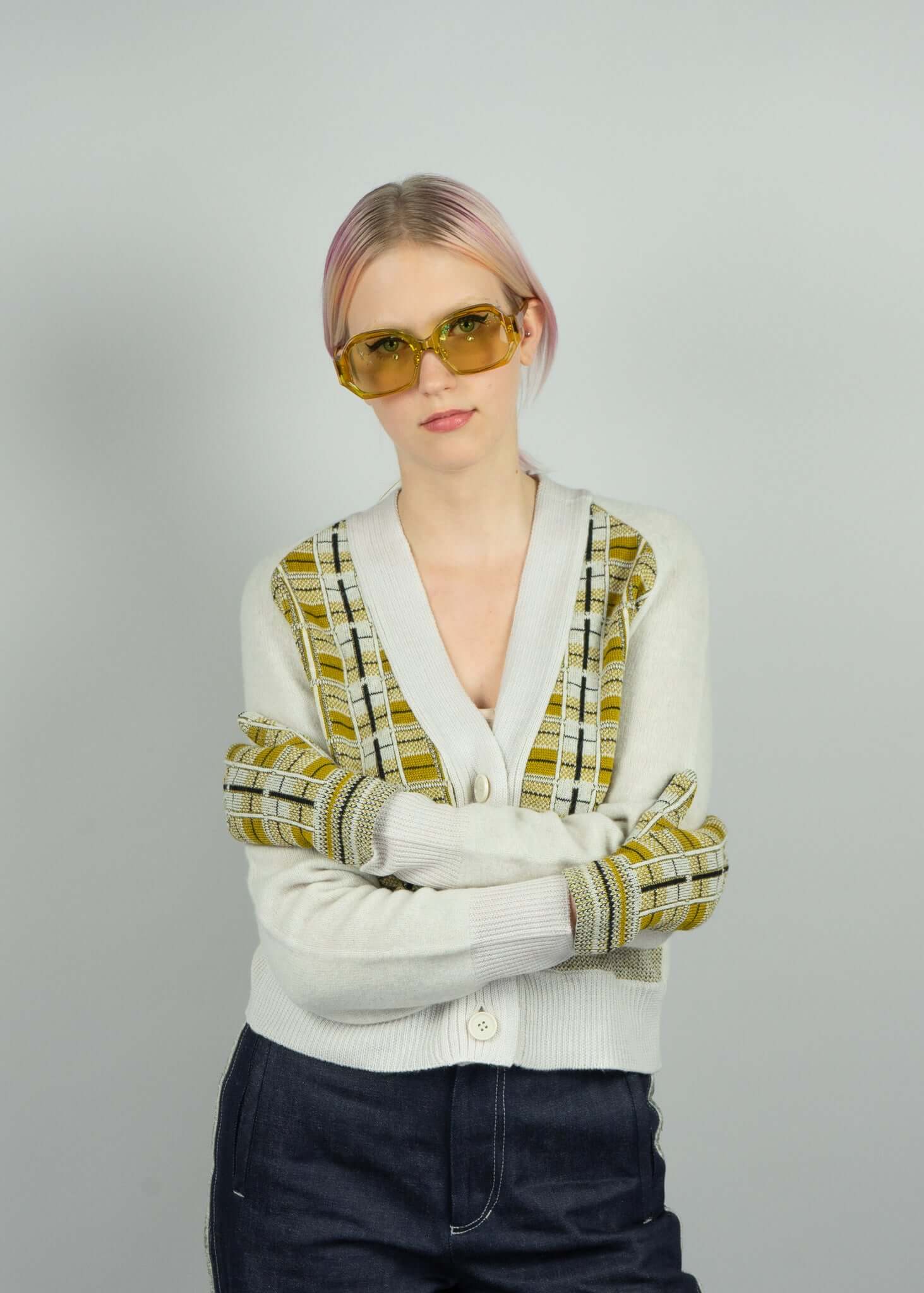 Weste mit V-Ausschnitt, drei Knöpfen und abstraktem Muster vorne, Ärmel und Rücken uni.